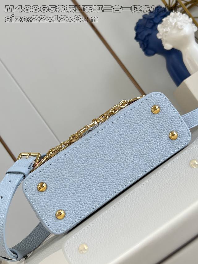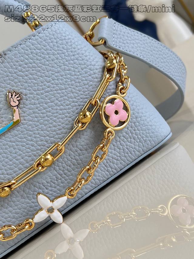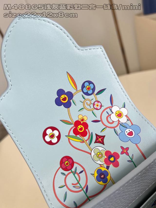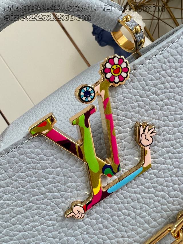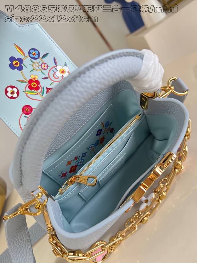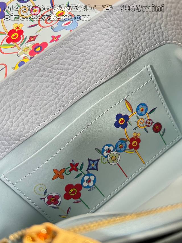 Exclusive, genuine, and genuine photos of the M48865 light gray-blue rainbow two-in-one chain mini M13707. This Capucines East West mini bag from the Louis Vuitton x Takashi Murakami re-edition collection features a horizontal design, offering a fresh take on the brand's classic design. Luxurious cowhide leather and metal hardware exude a matte finish, while ample space accommodates a phone, a long wallet, and other daily essentials. The removable and adjustable leather shoulder strap allows for versatile styling options. 22 x 12 x 8 cm (Length x Height x Width) N