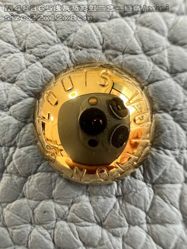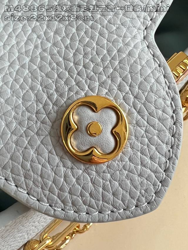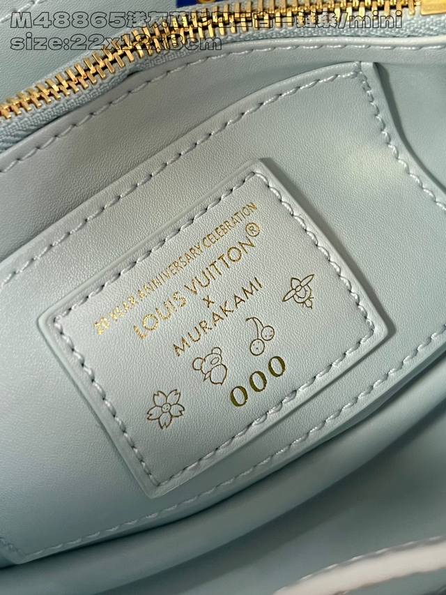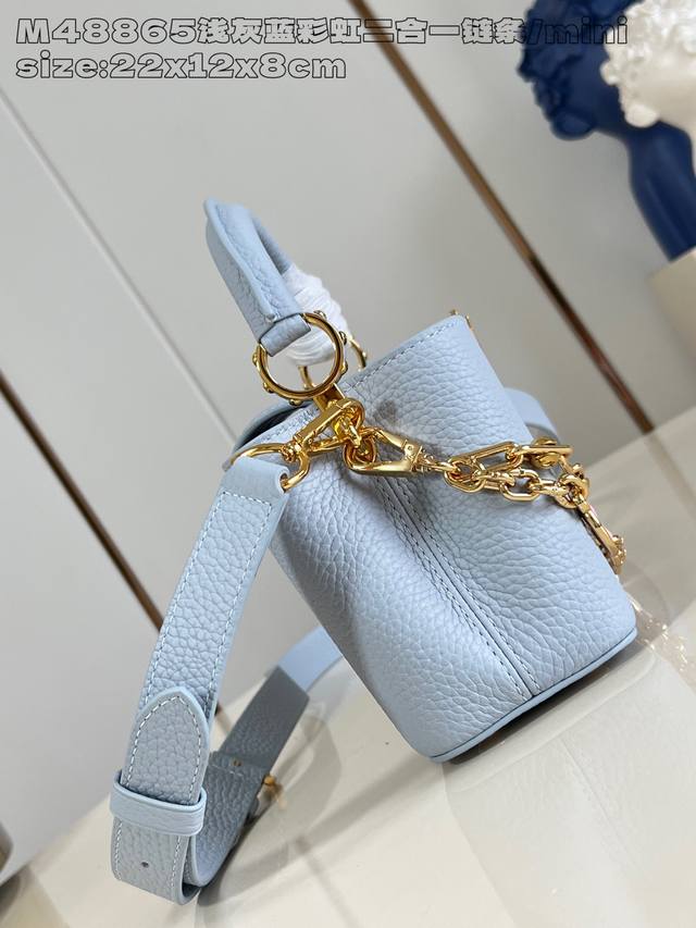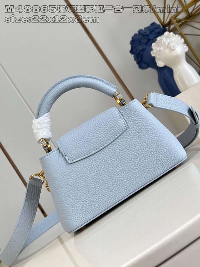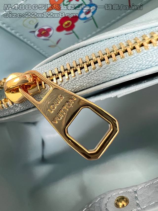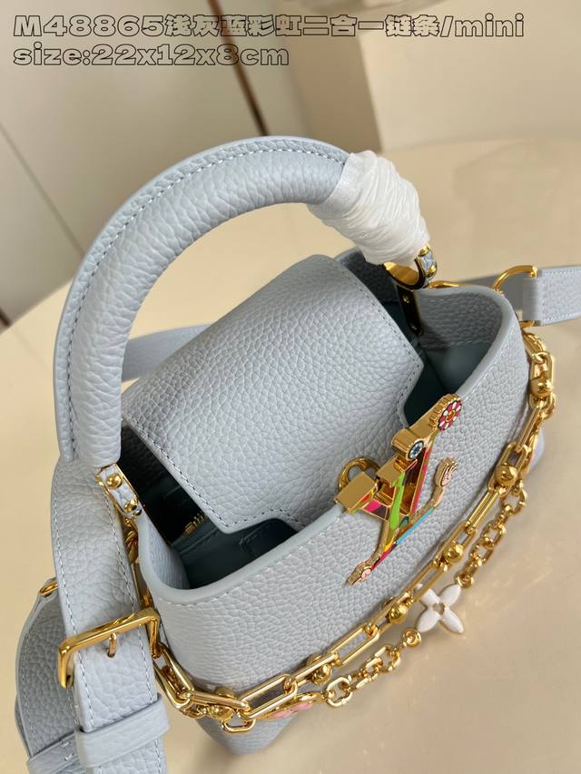 Exclusive, genuine, and genuine photos of the M48865 light gray-blue rainbow two-in-one chain mini M13707. This Capucines East West mini bag from the Louis Vuitton x Takashi Murakami re-edition collection features a horizontal design, offering a fresh take on the brand's classic design. Luxurious cowhide leather and metal hardware exude a matte finish, while ample space accommodates a phone, a long wallet, and other daily essentials. The removable and adjustable leather shoulder strap allows for versatile styling options. 22 x 12 x 8 cm (Length x Height x Width) N