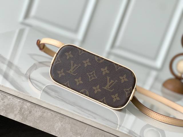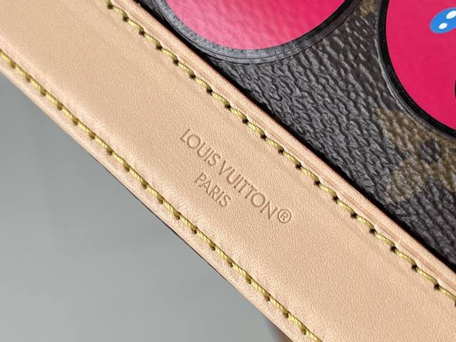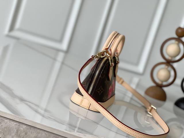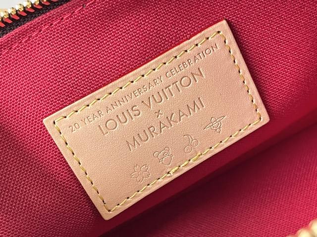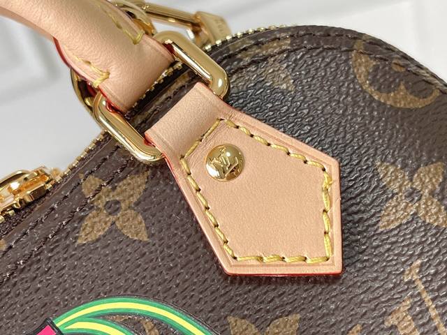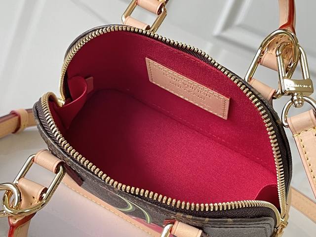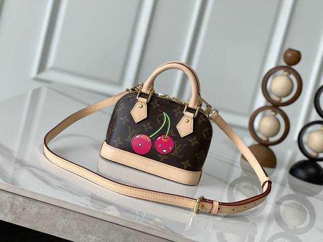 Exclusive photos of the chip-coded version M13416. This Nano Alma handbag combines Monogram coated canvas with cowhide leather trim, creating a sleek silhouette that showcases the cherry motif from the Louis Vuitton x Murakami Takashi collection. The top handle and detachable, adjustable shoulder strap allow for versatile carrying options, while the interior accommodates everyday essentials like a short wallet and a large smartphone. Dimensions: 12 x 8 x 18 cm (H x W x L)