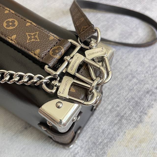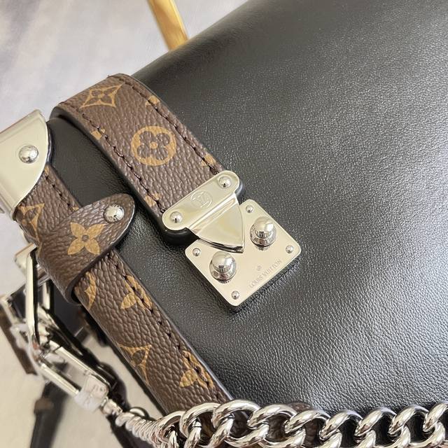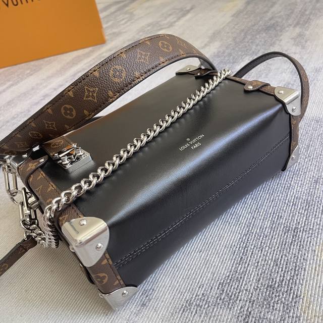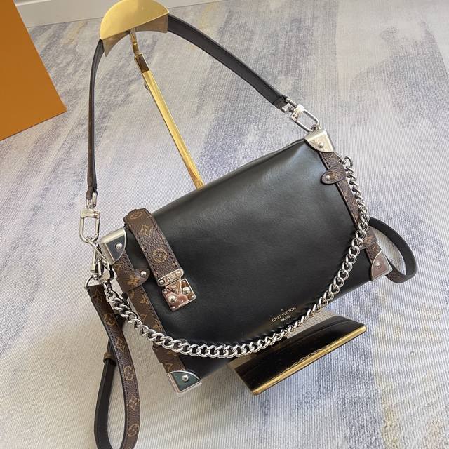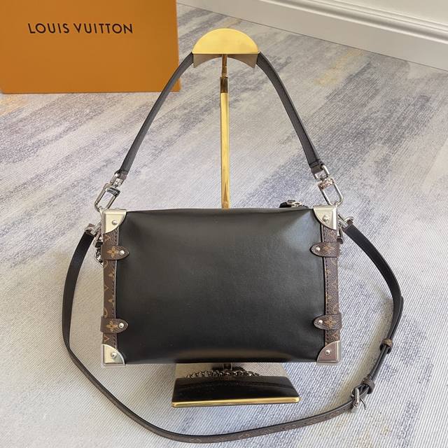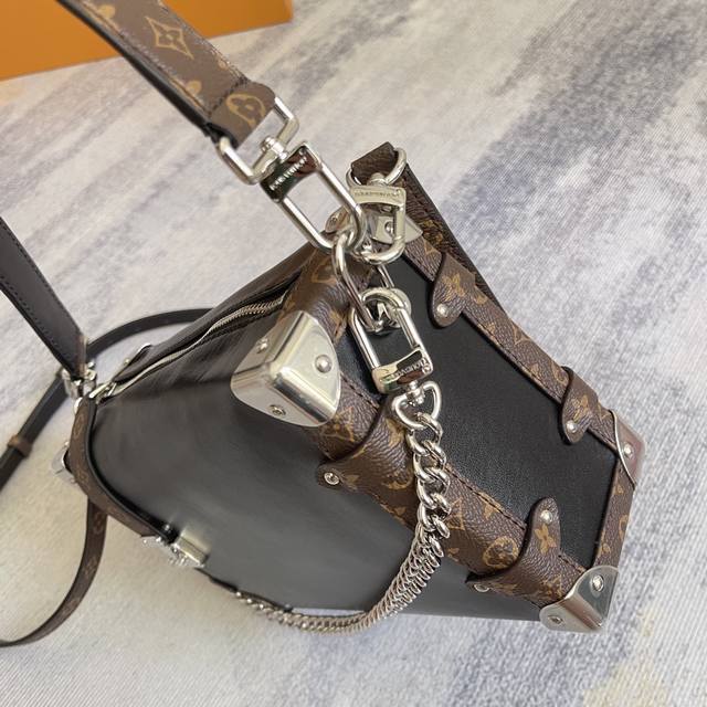 Exclusively customized, top-grain leather, top-grade, original, enhanced, chip-enhanced version (M15195). This Side Trunk Vibe handbag reimagines the iconic Side Trunk silhouette with an avant-garde design, inspired by Louis Vuitton's traditional travel trunks. Crafted from smooth, glossy Vibe cowhide leather, it features a leather-wrapped rivet frame and metal S-Lock clasp, embodying a rock-chic aesthetic. A detachable chain, detachable leather handle, and adjustable leather shoulder strap offer a wide range of carrying options. Dimensions: 23.5 x 16.0 x 8.5 cm (L x H x W) (