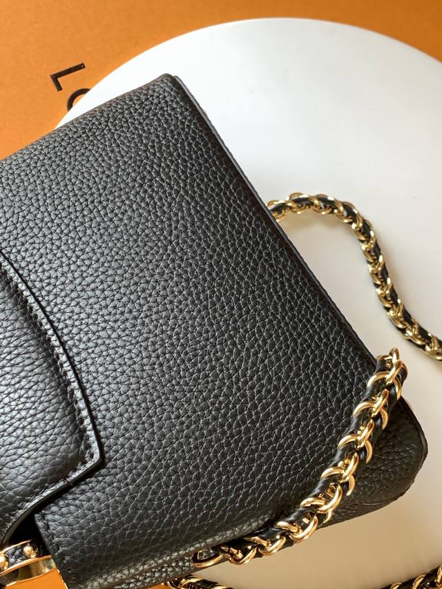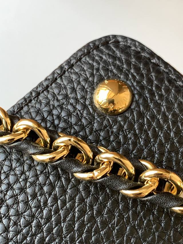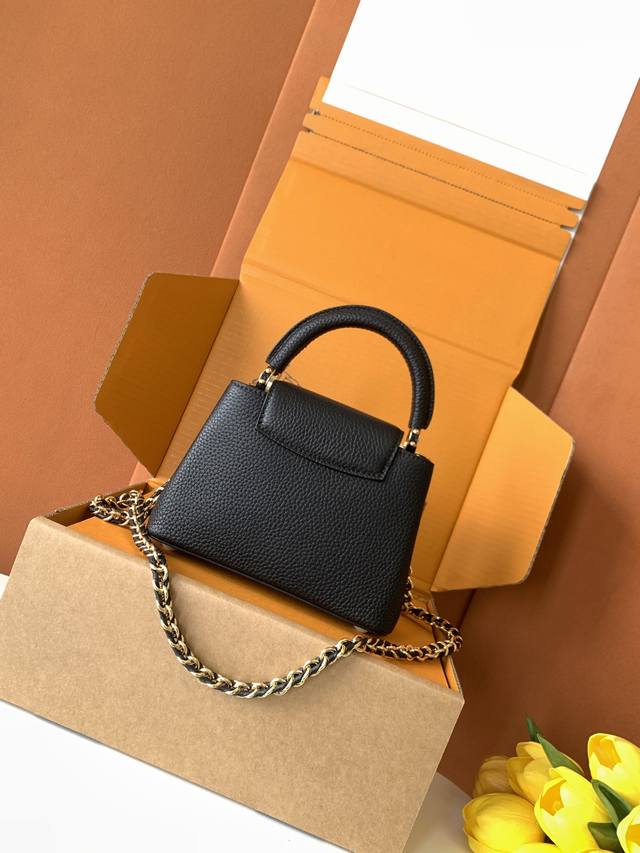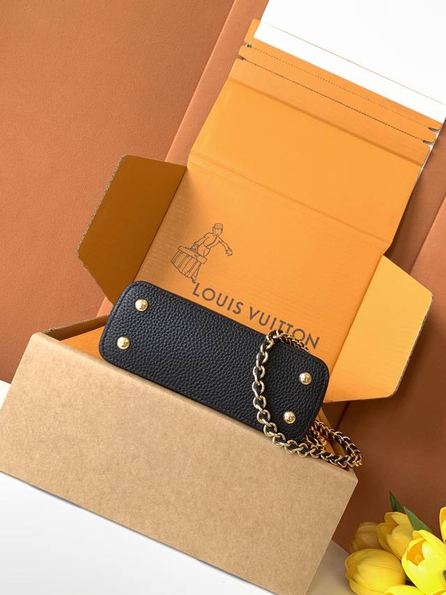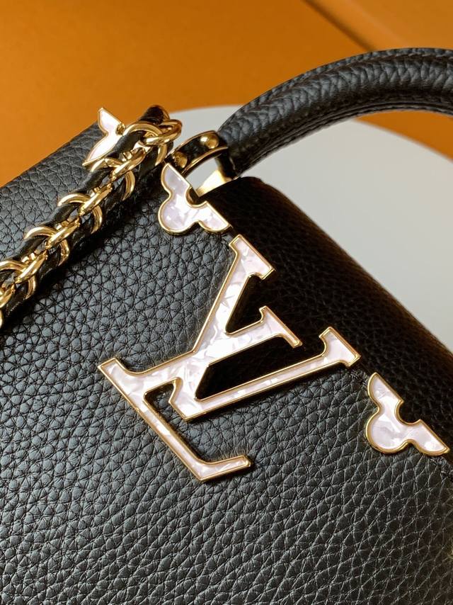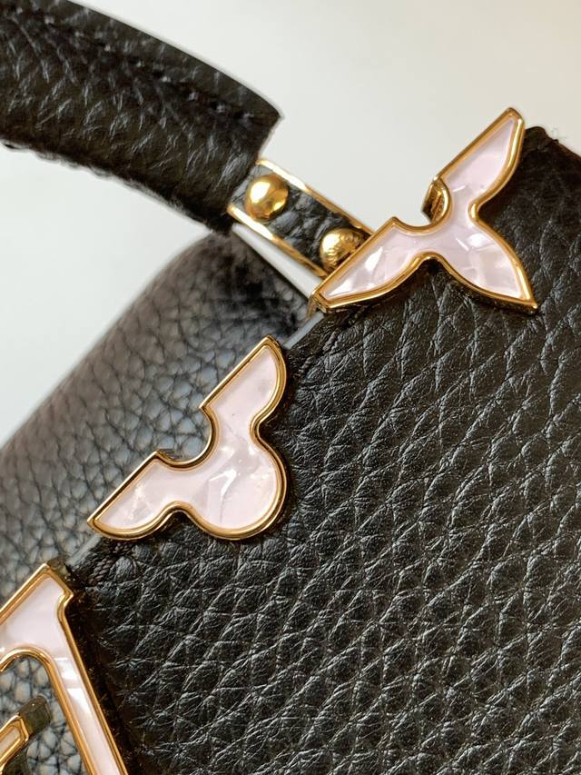 Extra-grade steel M10167 black. This Capucines Nano handbag, from the Capucines Flower Crown collection, is crafted from grained Taurillon imported cowhide leather into a sleek silhouette, effortlessly adaptable for both day and night. The Monogram flower shimmers with the lustre of shells, framing the Lv initials like jewels. A detachable chain completes the functional details. Dimensions: 21 x 14 x 8 cm. Taurillon cowhide leather. Taurillon cowhide trim. Cowhide leather lining. Shells and metal hardware. The flap can be placed inside or outside. The compartment features a patch pocket and mirrored metal studs. It can accommodate a short Victorine wallet, keys, lipstick, and other items. Chain: detachable.