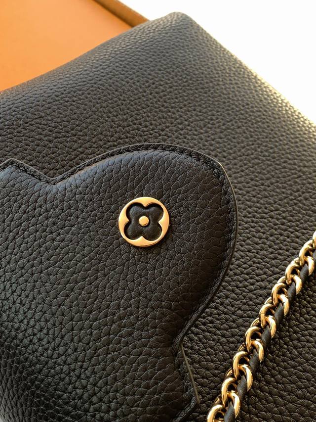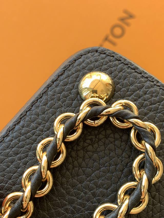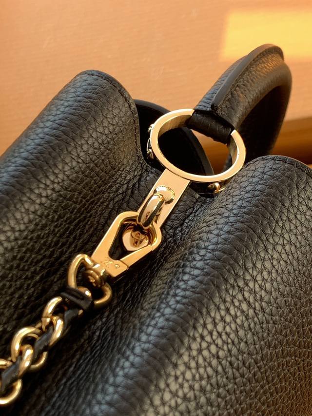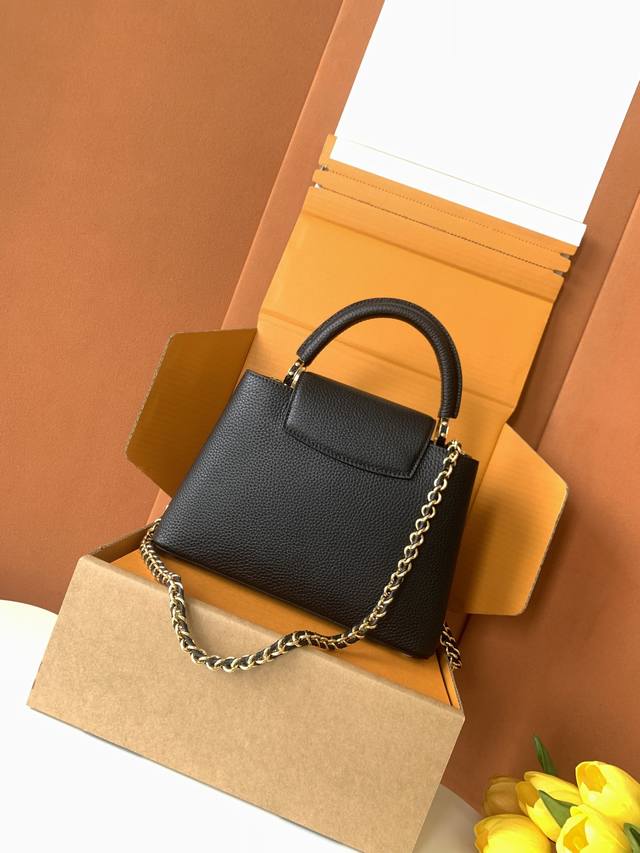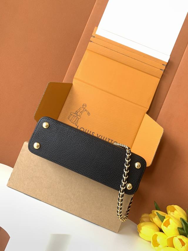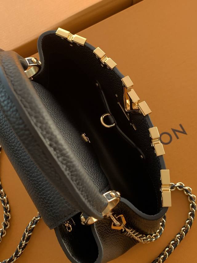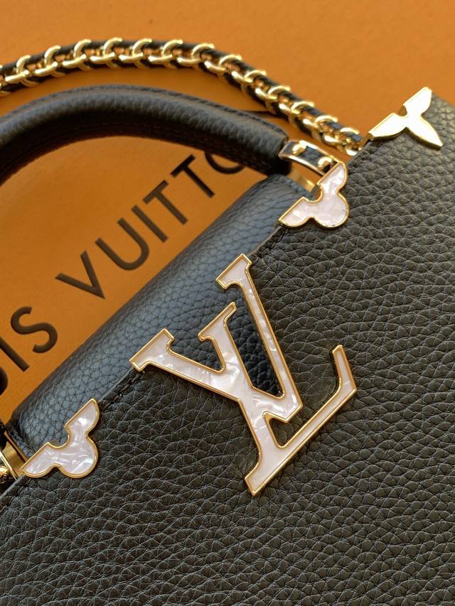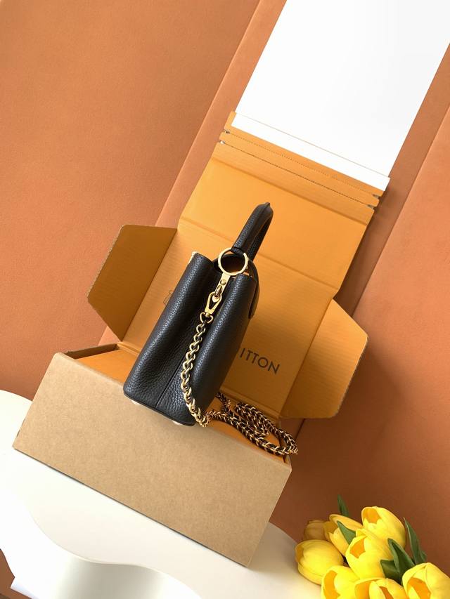 Extra-grade steel M10168 black and gold. This Capucines Nano handbag, from the Capucines Flower Crown collection, is crafted from grained Taurillon cowhide leather into a sleek silhouette, effortlessly adaptable for both day and night. The Monogram flower shimmers with a shell-like sheen, framing the Lv letters within, creating a jewel-like elegance. A detachable chain completes the functional details. Dimensions: 27 x 18 x 9 cm. Made of imported Taurillon cowhide leather. Taurillon cowhide trim. Cowhide leather lining. Shell and metal hardware. The flap can be placed inside or outside. The compartment features a patch pocket and mirrored metal studs. It can accommodate a short Victorine wallet, keys, lipstick, and other items. Chain: Removable.