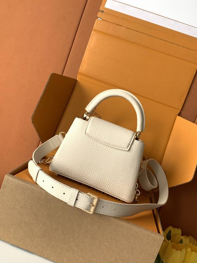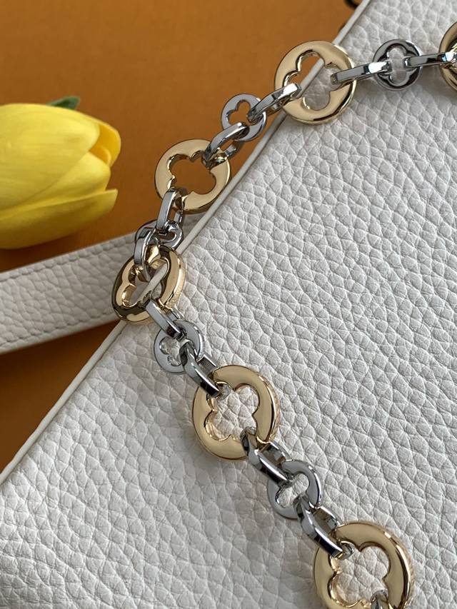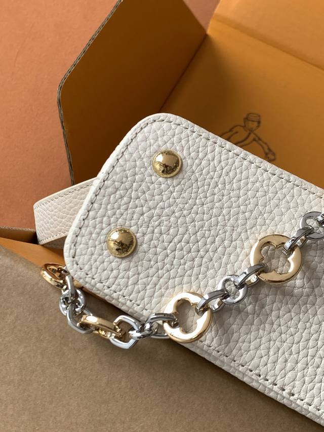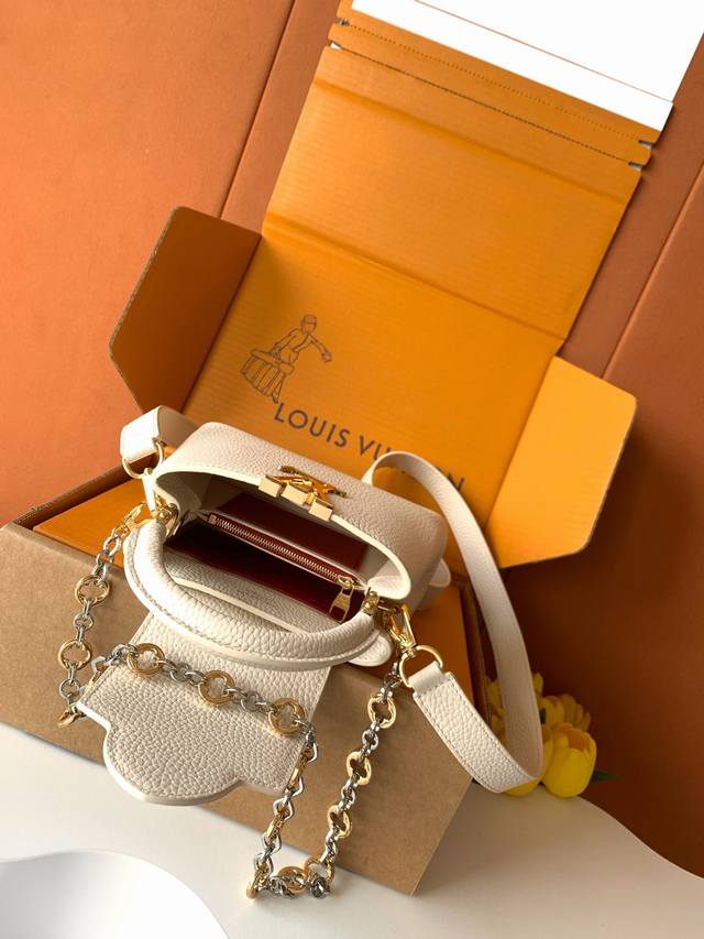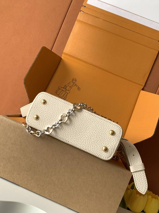 Extra-grade steel M12938 pearl white gold. This Capucines mini handbag, part of the Capucines chain on you collection, is crafted from soft Taurillon imported cowhide leather, creating ample space for everyday essentials like a small wallet, keys, and lipstick. The jewelry-inspired double-plated chain incorporates Monogram floral details, complementing the rounded Lv lettering. The flap can be worn either inward or outward.