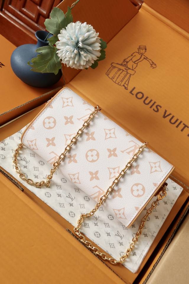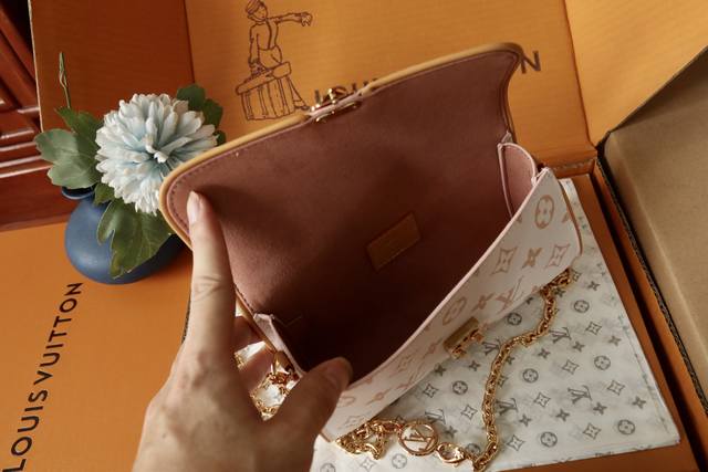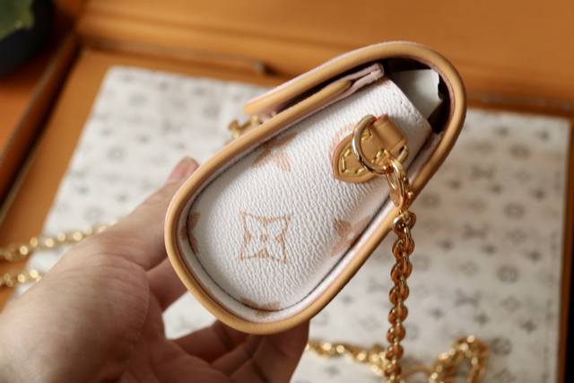 . This Pochette Camille Lt handbag, clad in Monogram Dune canvas, pays homage to the original design introduced at the Louis Vuitton Spring/Summer 2000 runway. The cowhide leather trim is imbued with sophisticated brushstrokes, while the detachable chain and the dazzling S-Lock clasp complement each other perfectly, making it suitable for crossbody, shoulder, or hand carry.