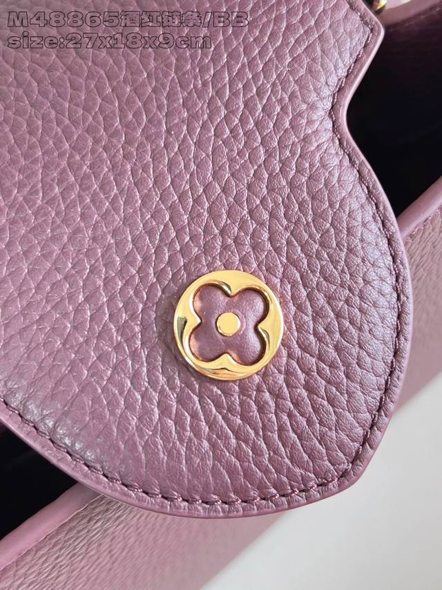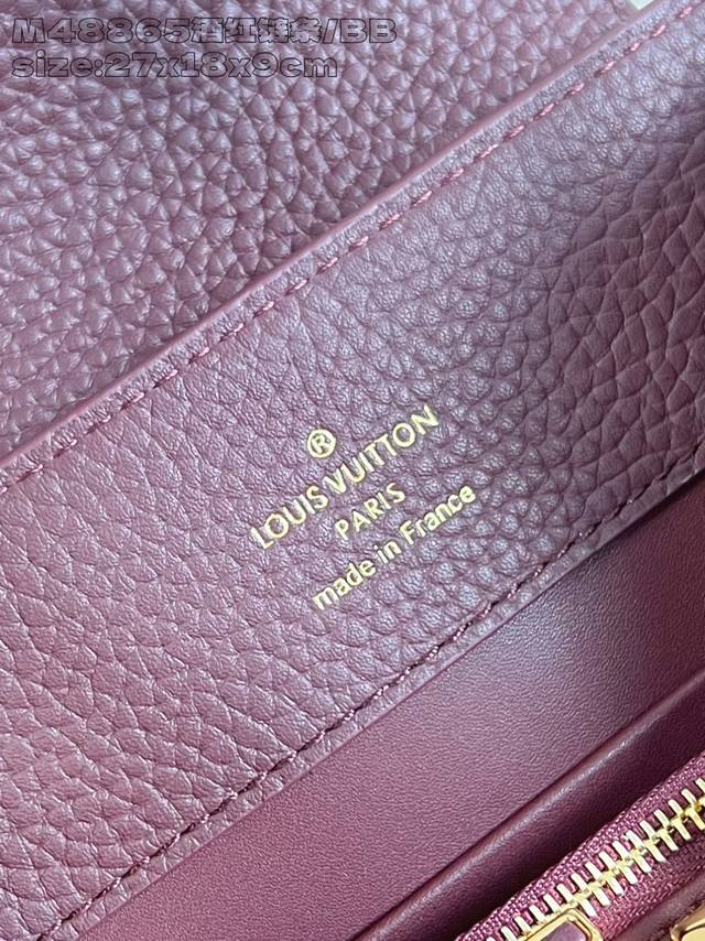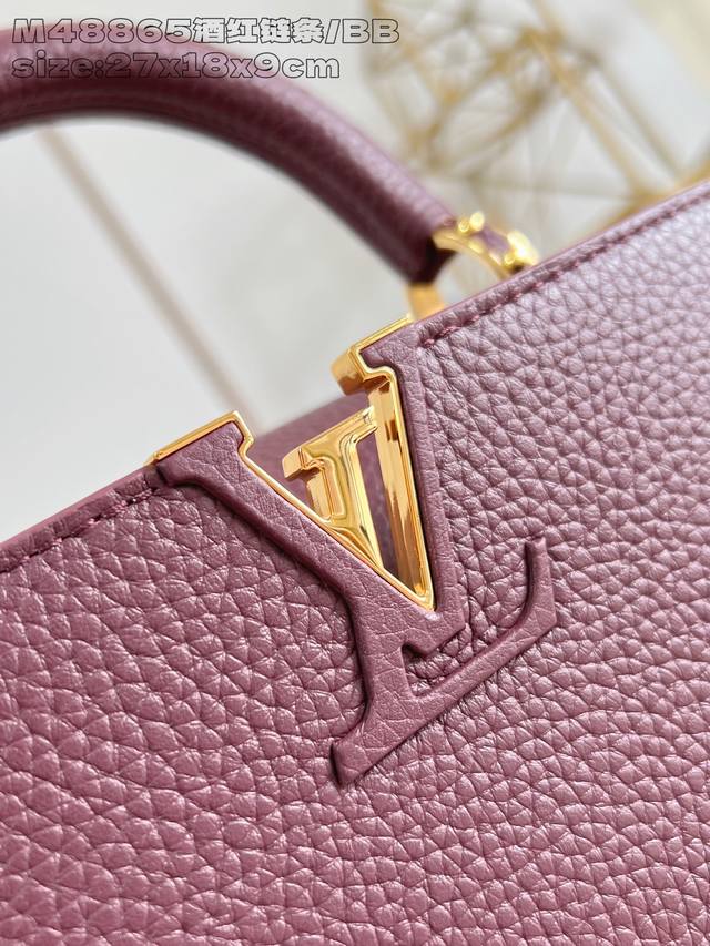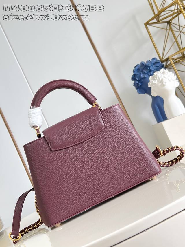 Factory Price: Original M48865 Burgundy Chain, Small Size. This Capucines Bb handbag is crafted from fine Taurillon leather, accented by a shimmering handle and the iconic Lv logo. The removable shoulder strap allows for seamless shoulder or crossbody carry. Dimensions: 17.3 x 9 x 27 cm (H x W x L)