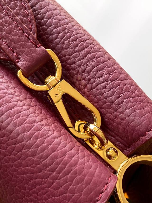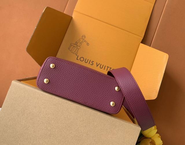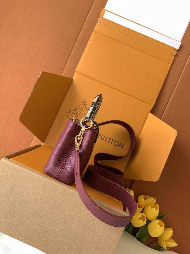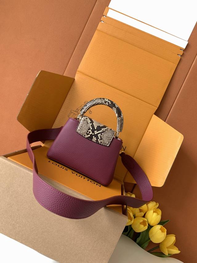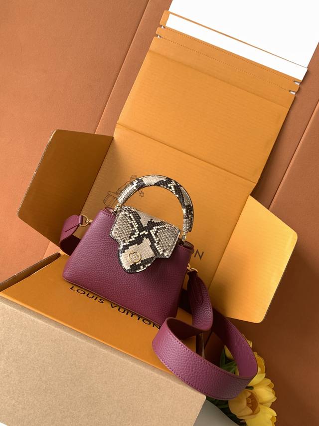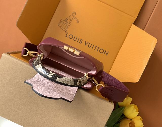 This bag is made of grained Taurillon imported leather, with the flap, top handle, and LV logo in python leather. This Capucines mini handbag has a luxurious feel. The light-colored leather lining provides a striking contrast, and there is an interior slip pocket. The detachable wide strap, also made of Taurillon leather, offers multiple carrying options.