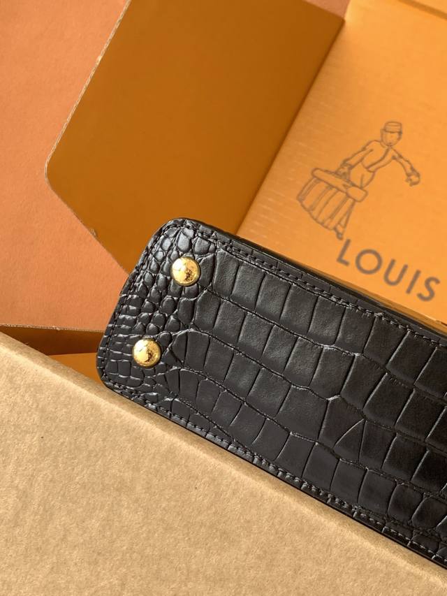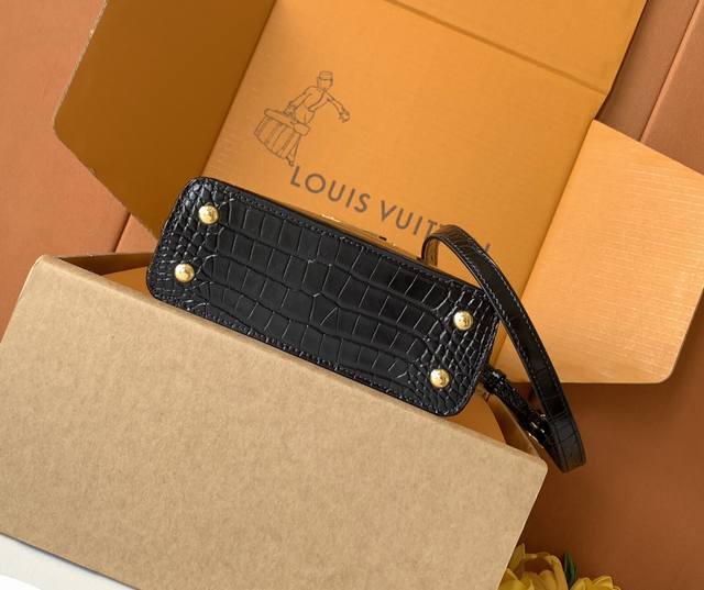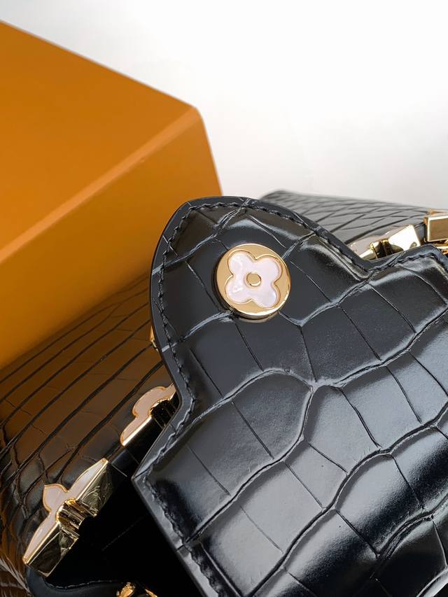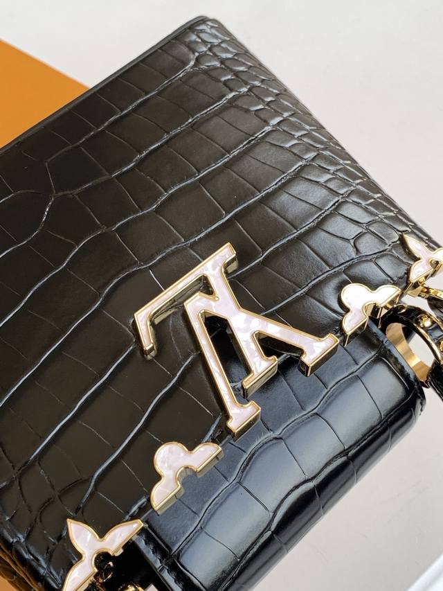 Factory Price p Exclusive Custom-Made Premium Grade All-Steel Hardware M86153 Imported Black Glossy Crocodile Pattern Gold Buckle Dynamic 163C01 Dynamic Code Ddd This Capucines BB handbag features a Monogram flower depicted in lustrous seashells blooming gracefully along the upper edge, complementing the jewel-like LV lettering and showcasing Louis Vuitton's elegant style. The top handle and detachable slim shoulder strap offer multiple carrying options. 21.0 X 13.6 X 8.0 cm Length X Height X Width Ddd