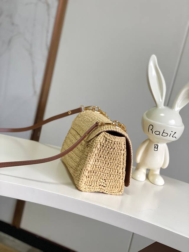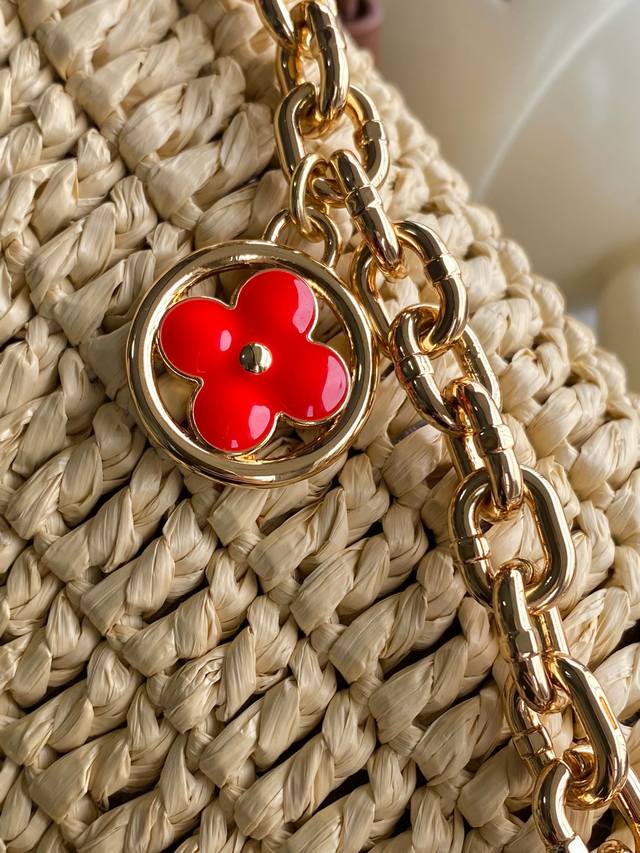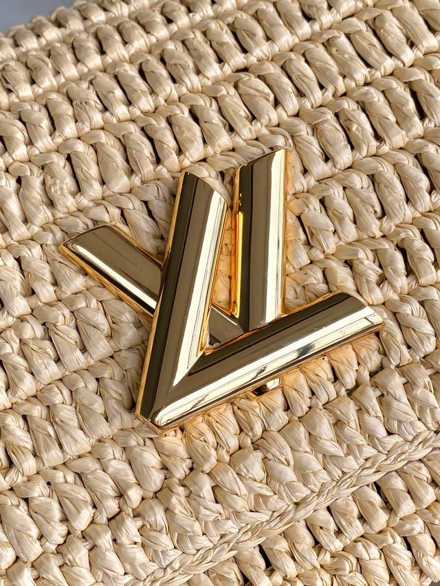This Twist Slim handbag embodies the relaxed style of the French Riviera, showcasing the brand's exquisite craftsmanship with creative touches. The raffia body is accented with contrasting leather trim and the signature LV Twist lock. Multiple pockets allow for organized storage, and a removable mirror adds functionality.