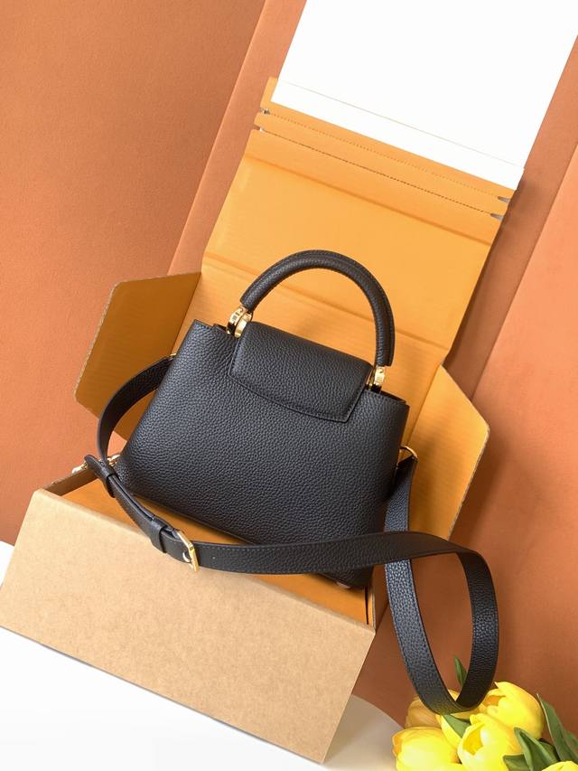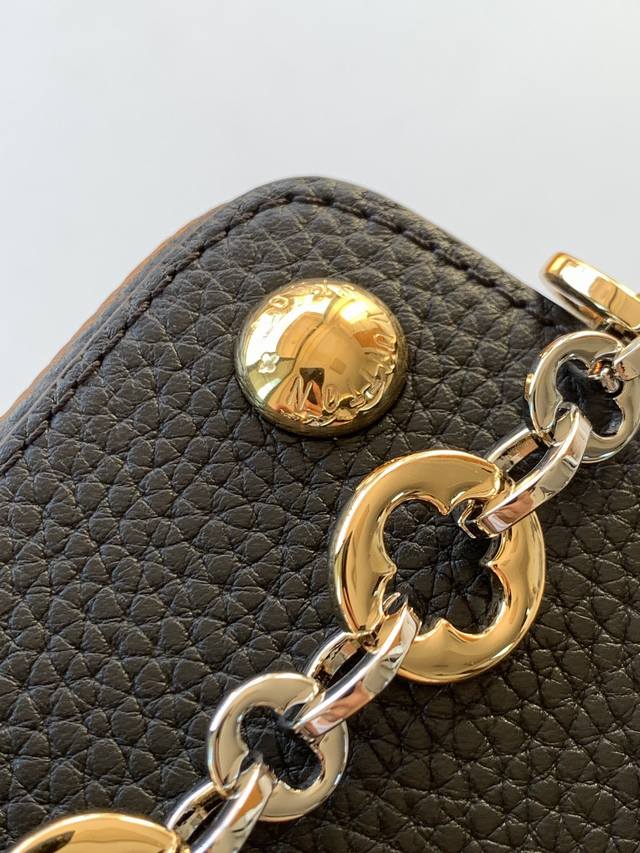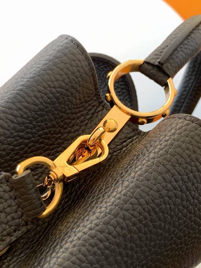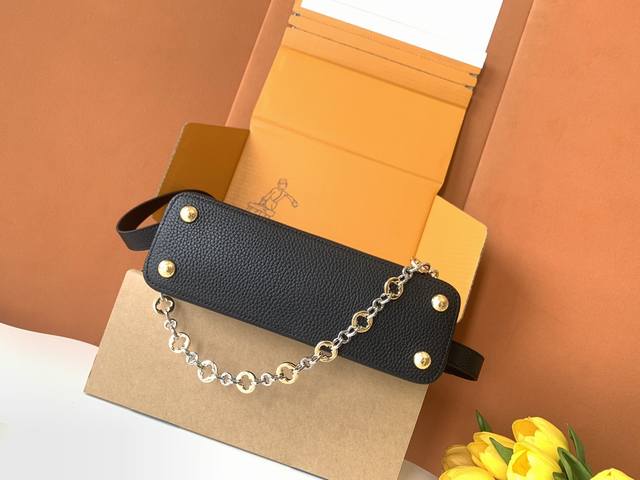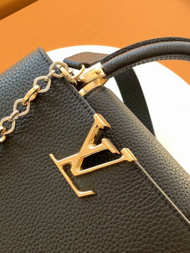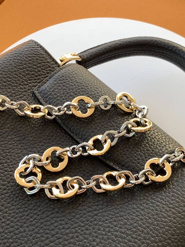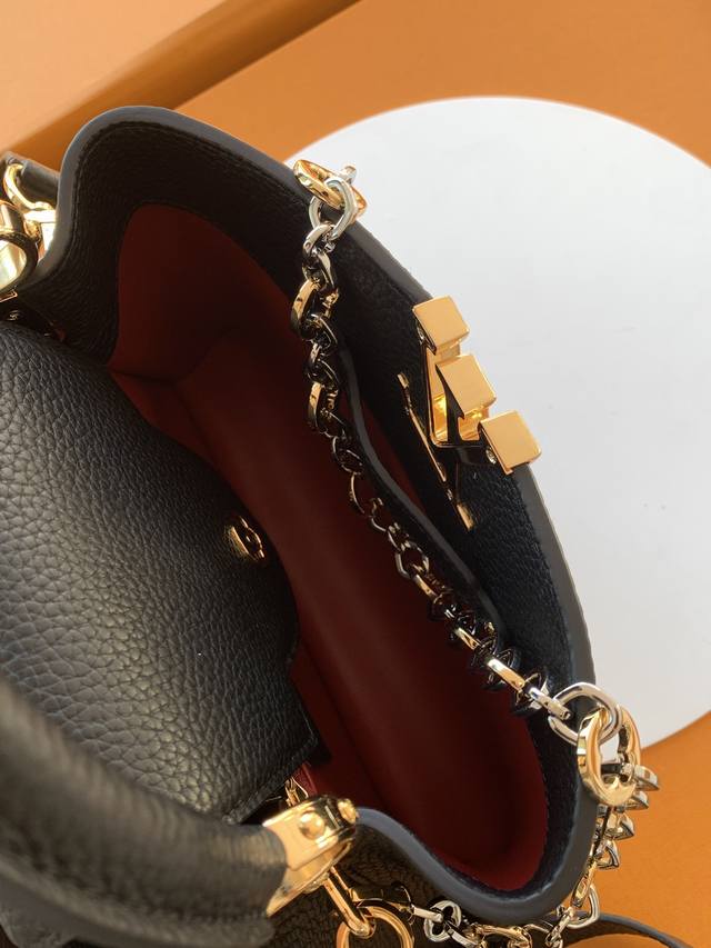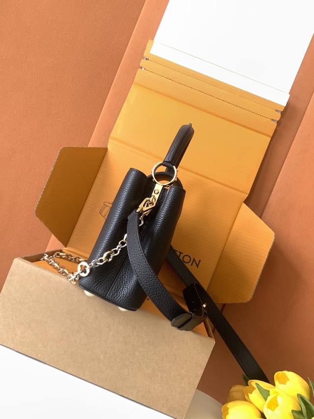 Factory Price: p Premium All-Steel M12936 Black Gold M12936 Pearl White Gold. This Capucines mini handbag from the Capucines Chain On You collection is crafted from soft imported Taurillon cowhide leather to create ample space for everyday essentials like a small wallet, keys, and lipstick. The jewelry-style double-plated chain incorporates Monogram floral details, complementing the rounded Lv lettering. The flap can be folded in or out.
