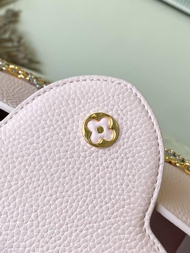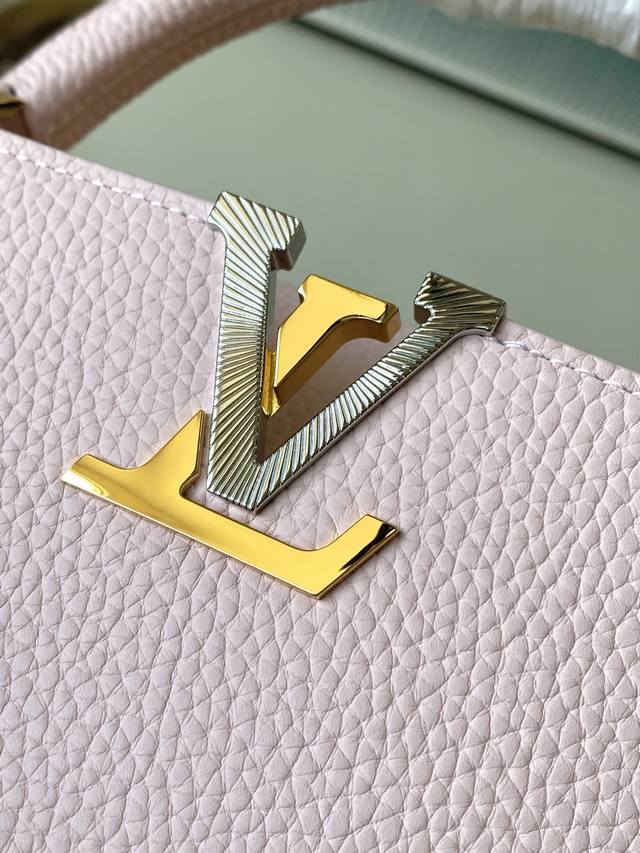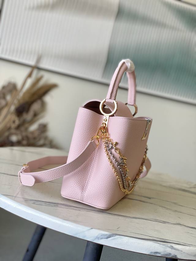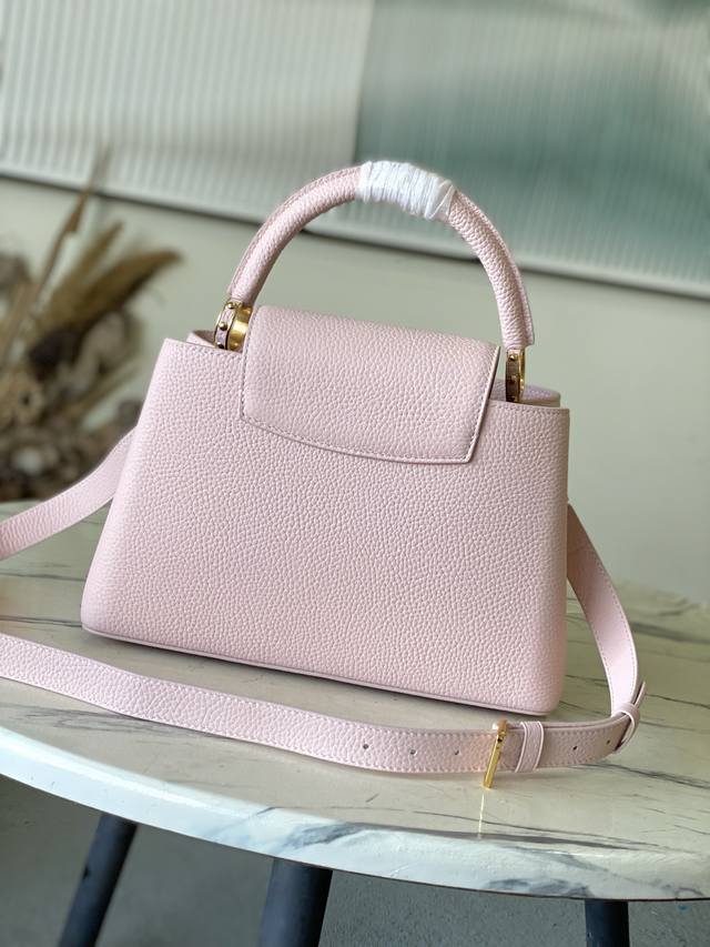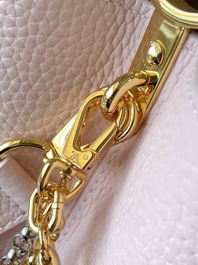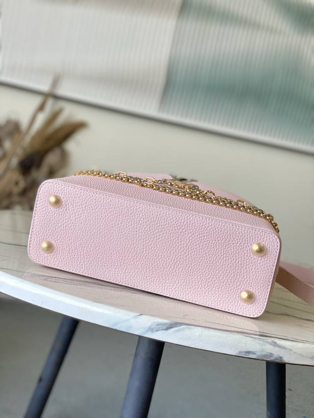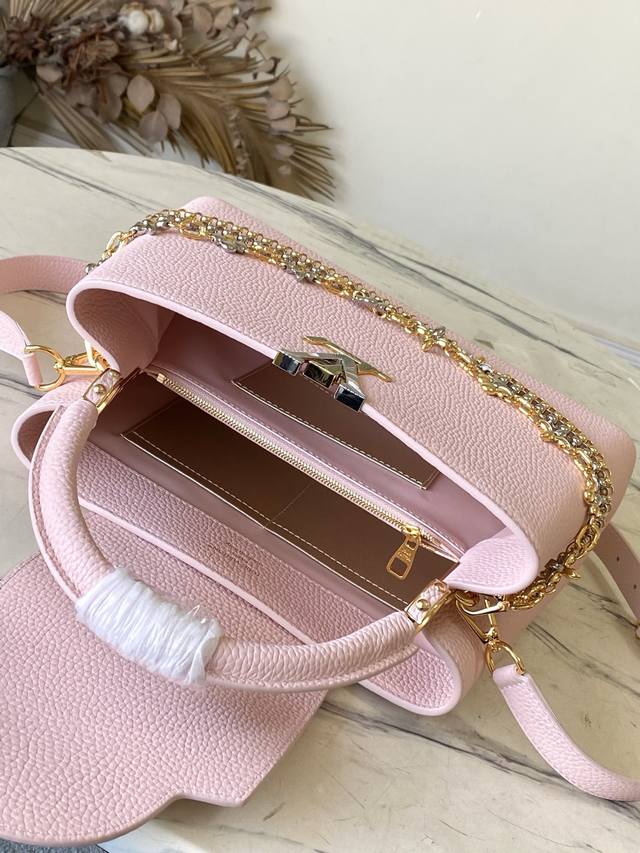 Factory Price p Premium Original Leather M27039 M48865 Ballet Pink Infinity Chain This Capucines features a striking, sophisticated gemstone-toned version adorned with the brand's double-galvanized Infinity chain crafted from Taurillon leather and embellished with the iconic Monogram floral pattern and LV initials. These logos are treated with a unique radiating effect. This dual-carry style includes an internal flat pocket and offers multiple wearing options. Size: 31 * 20 * 11 cm DDD