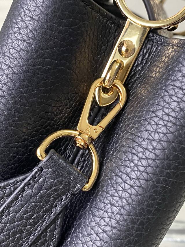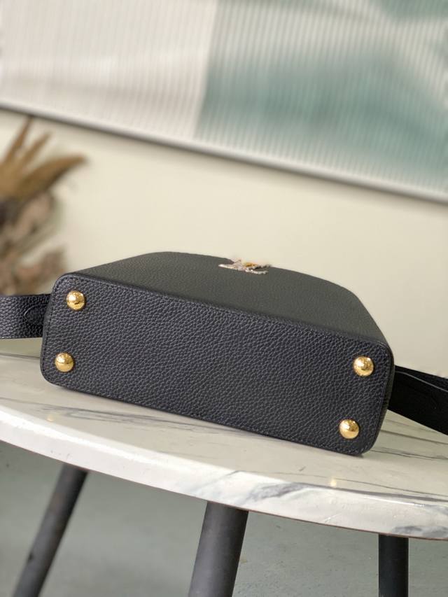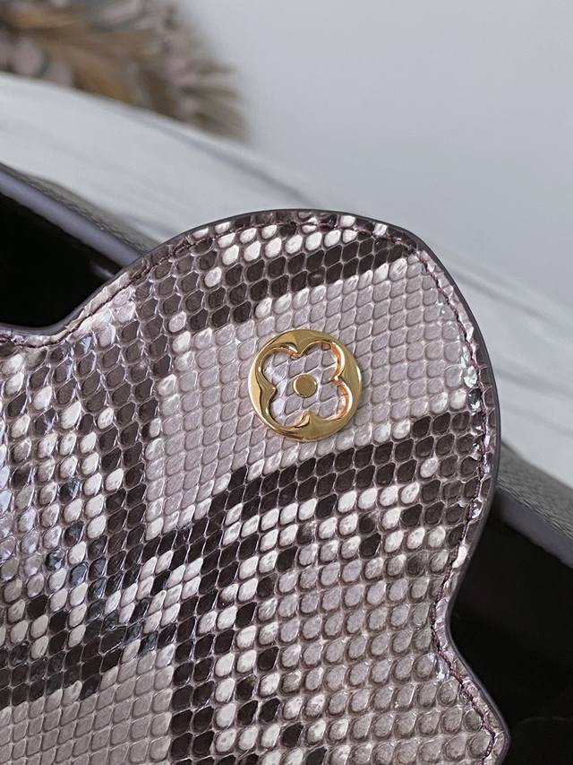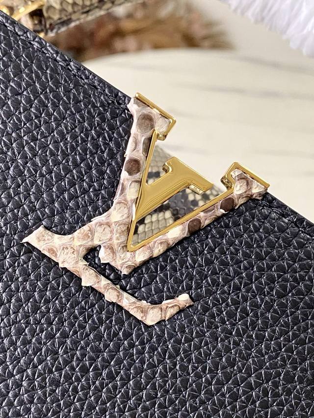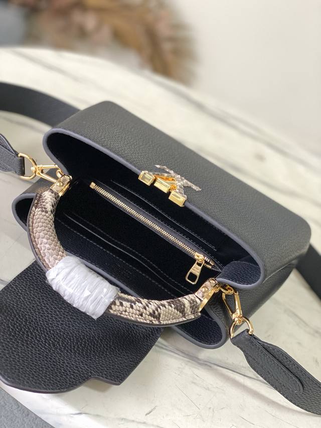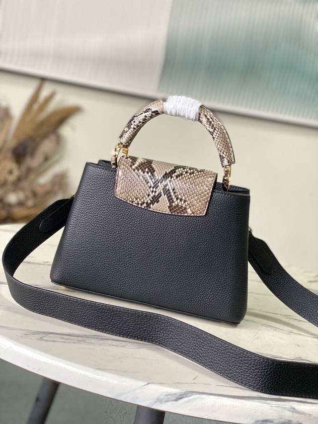 Factory Price p Premium Original Leather N48865 Black snakeskin small bag. The body is made of grained Taurilon leather, with the flap, top handle, and LV logo in python skin. This Capucines mini handbag exudes luxury. The light-colored leather lining provides a striking contrast, and it features an interior slip pocket. A detachable wide strap, also made of Taurilon leather, offers versatile carrying options. Dimensions: 27
