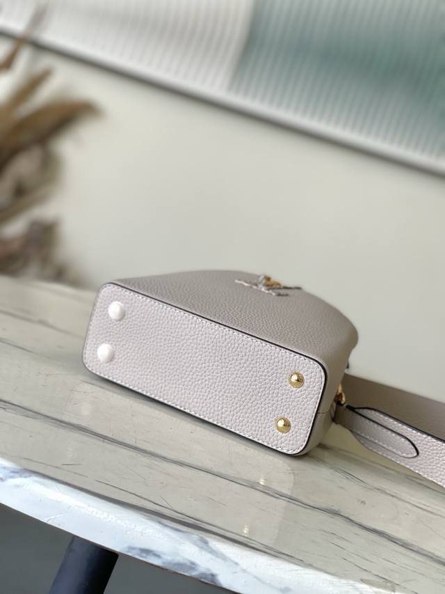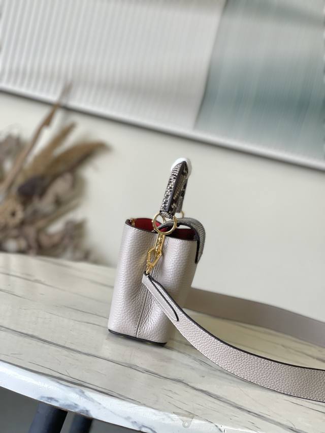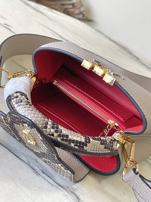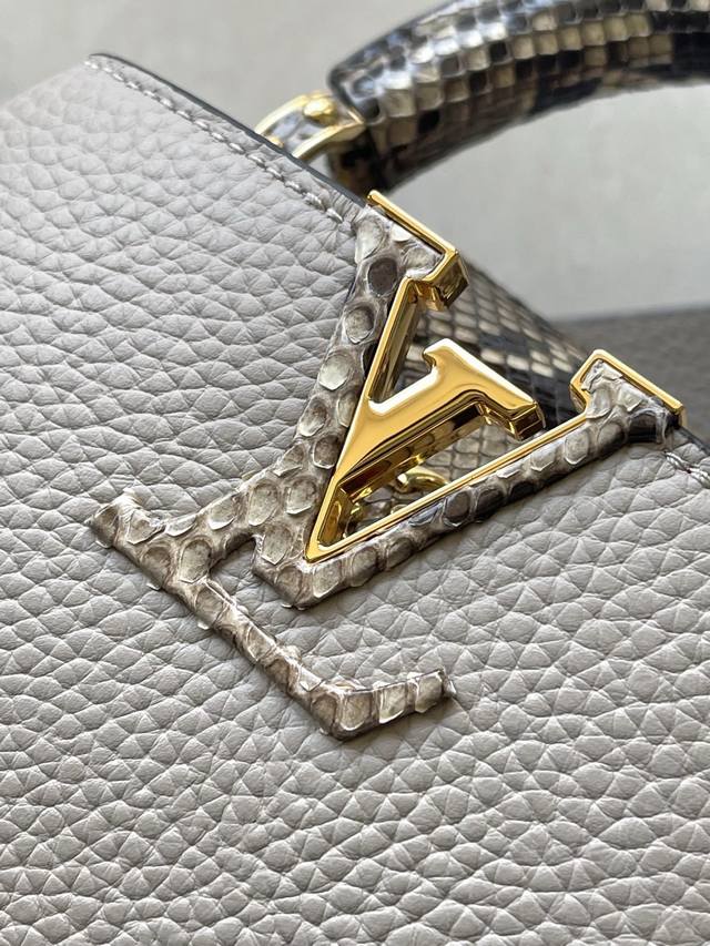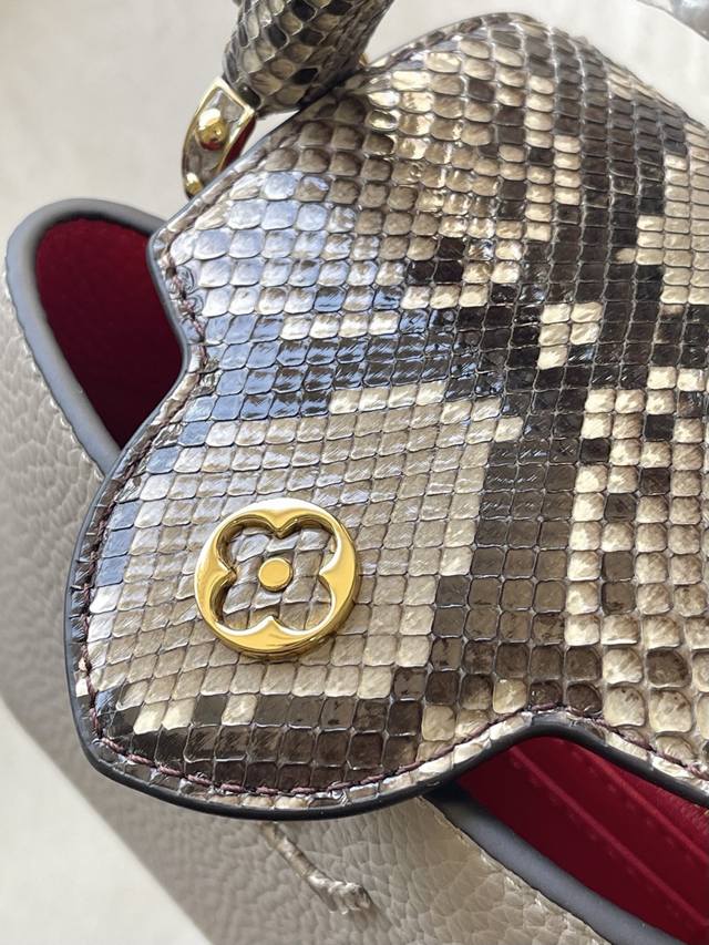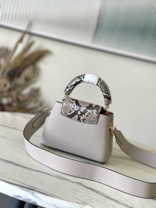 Factory Price p Premium Original Leather N48865 This grey snakeskin mini bag features a grained Taurilon leather body, with the flap, top handle, and LV logo in python skin. This Capucines mini handbag exudes luxury. The contrasting light-colored leather lining and interior slip pocket provide a striking look. A detachable wide strap, also made of Taurilon leather, offers versatile carrying options. Dimensions: 21