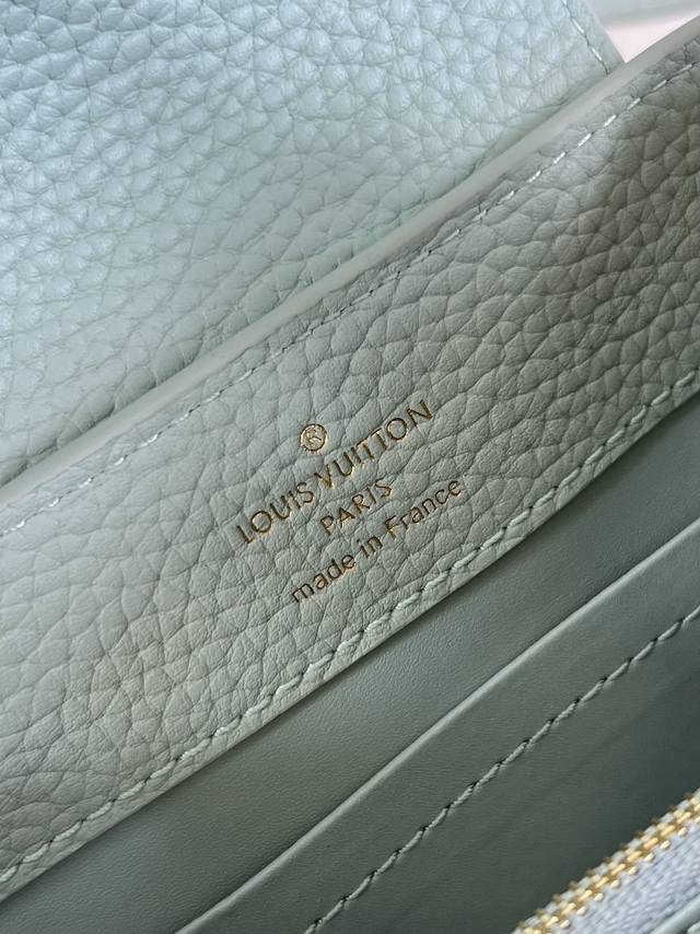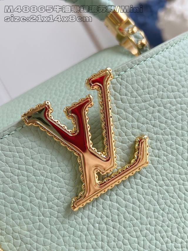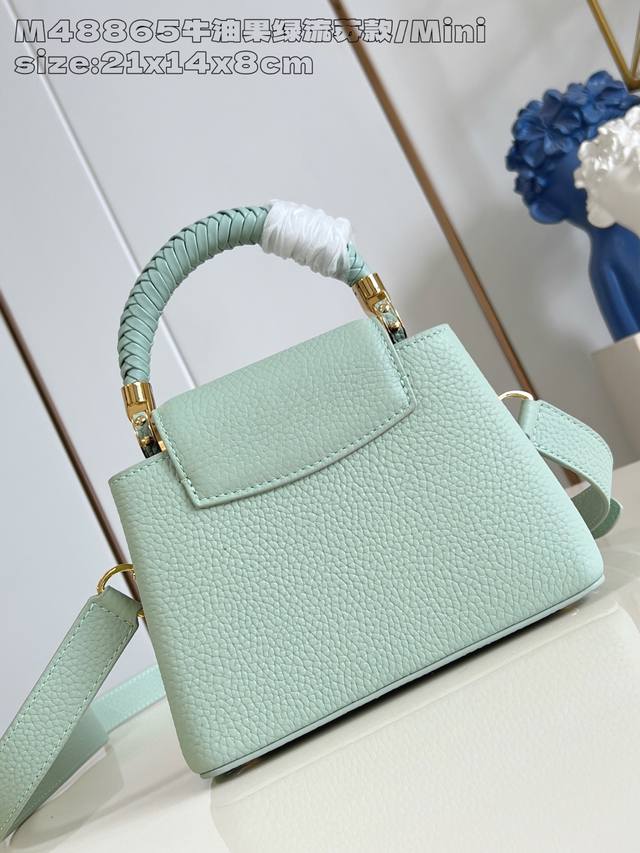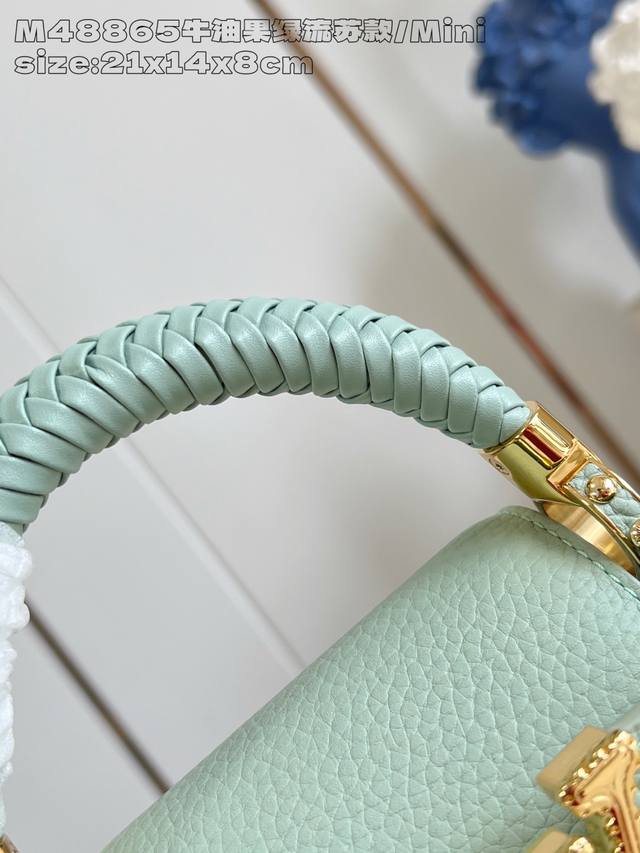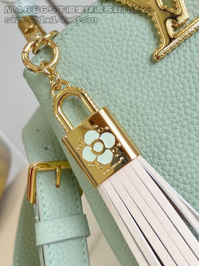 Factory Price: p Premium Original M48865 Avocado Green Tassel Mini M15157. The Capucines collection is named after the Parisian street where Louis Vuitton opened its first store in 1854. This Capucines mini bag features braided leather handles, tassel embellishments, and a padlock, embodying the signature elements of the Crafty collection. The Lv lettering is embossed, a subtle testament to the brand's exceptional craftsmanship. 13.6 x 8 x 21 cm (H x W x D)