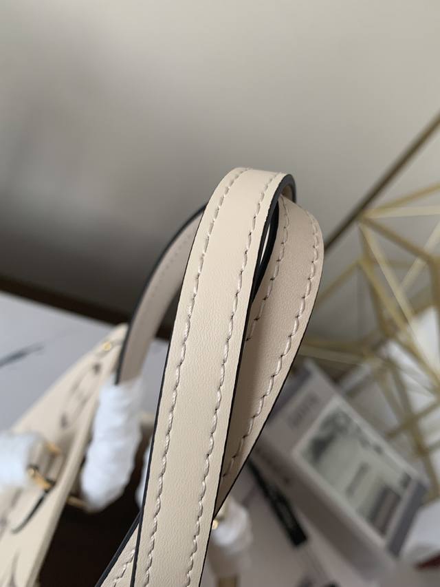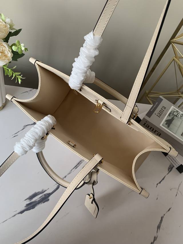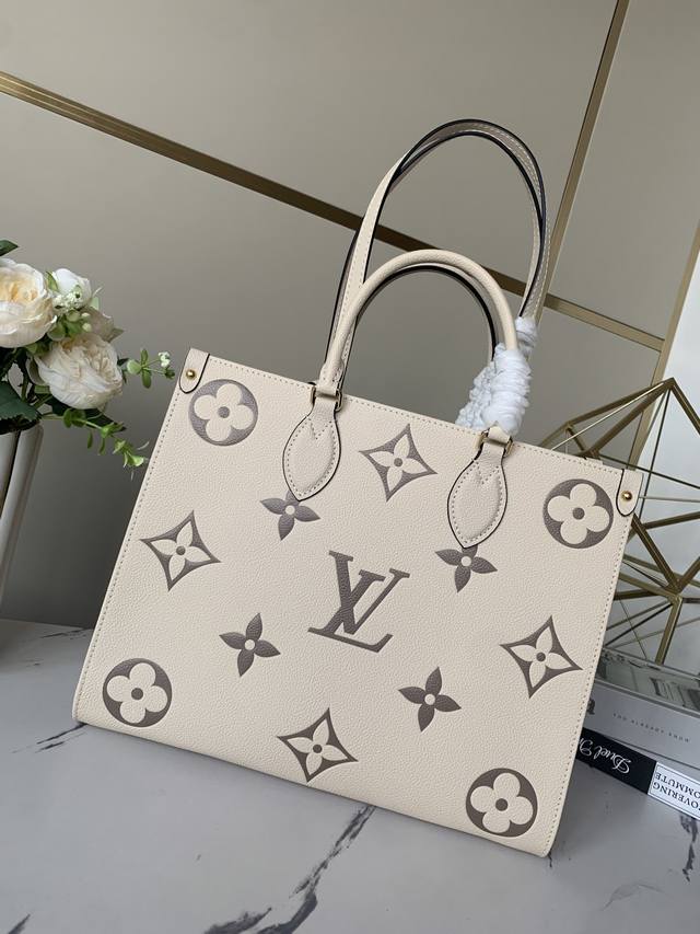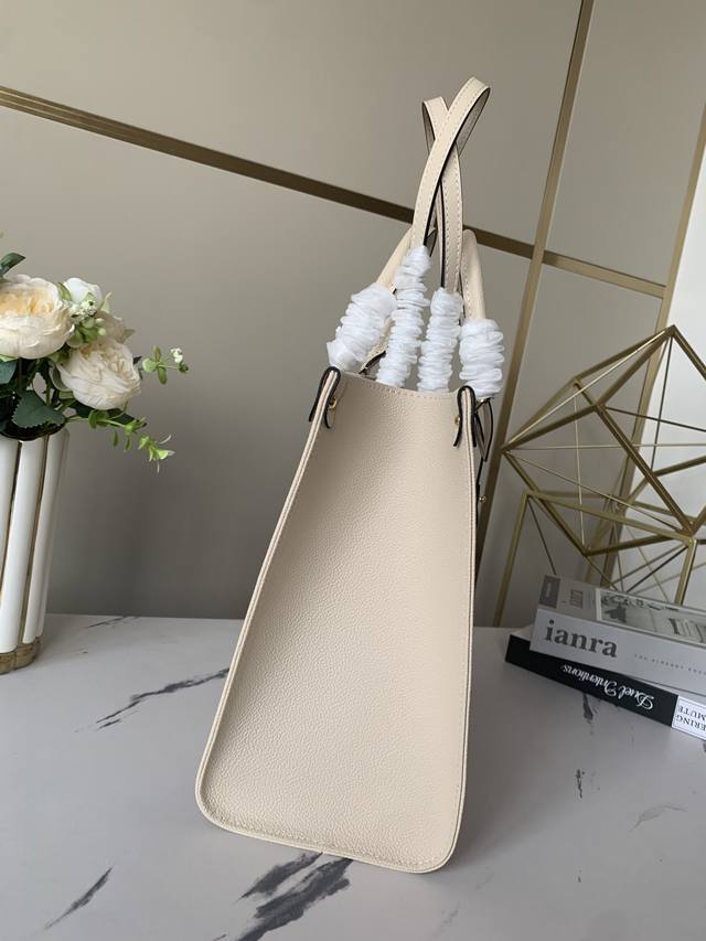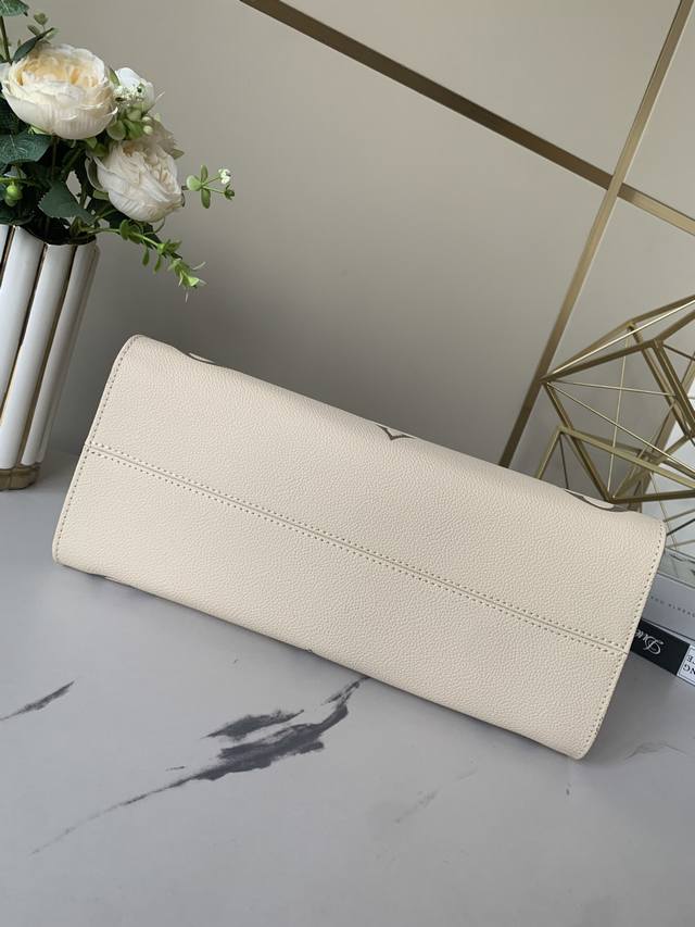 Factory price: p, top-grade, exclusive Louis Vuitton m45493 creamy white Onthego medium handbag. This Onthego medium tote features a Monogram pattern that's first printed and then embossed onto soft, grained cowhide. The ample interior accommodates a laptop and other office supplies. Long and short handles facilitate hand or shoulder carry. Embossed grained cowhide, grained cowhide trim, microfiber lining, metal hardware, zippered interior patch pocket, and dual interior pockets. Handles: Double handles. Dimensions: 34.0 x 26.0 x 13.0 cm (Length x Height x Width