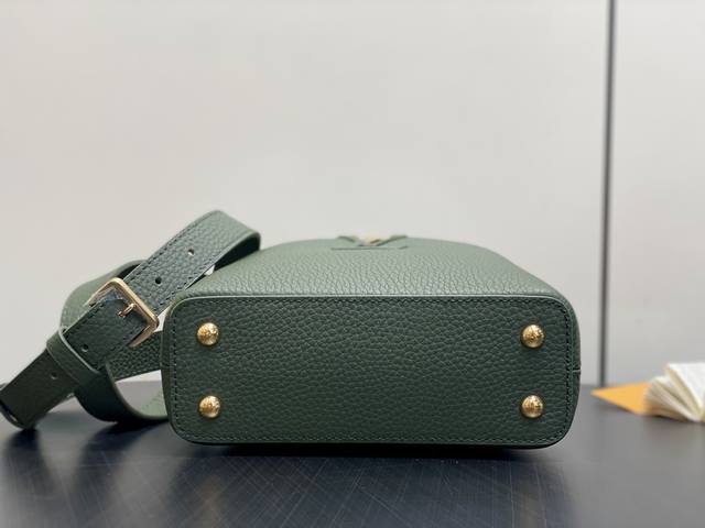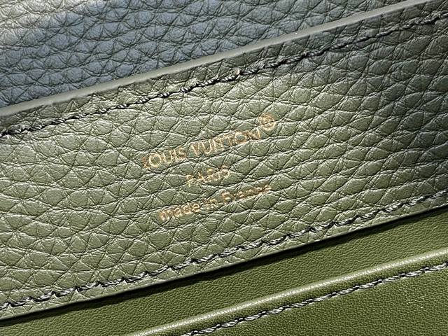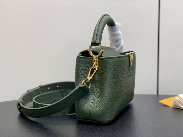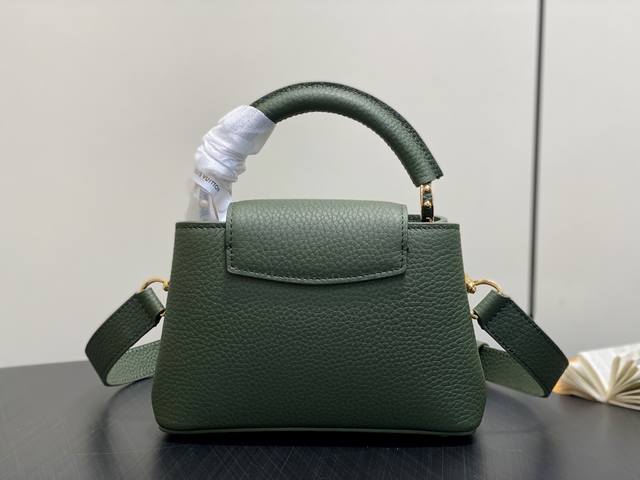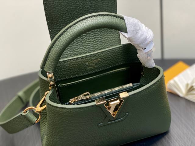 Factory Price p Top-Tier Original M24545 Dark Green Full Leather Capucines Mini Handbag (Na Ying Style) M24727 Capucines Medium Handbag. Launched in 2013, the Capucines is named after the Parisian street where Louis Vuitton first opened its store in 1854. Made of full-grain Taurillon calfskin with a classic flap: an exterior with blooming Monogram flowers and an interior with leather-covered LV lettering. Lightweight and suitable for all-day carrying, the detachable shoulder strap allows for hand, shoulder, or crossbody wear. 21 x 14 x 8 cm. DDD