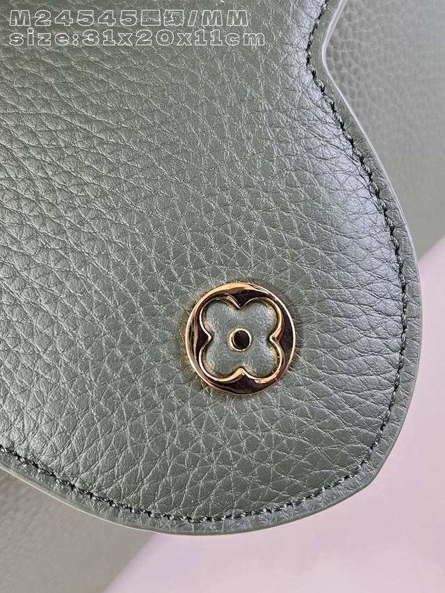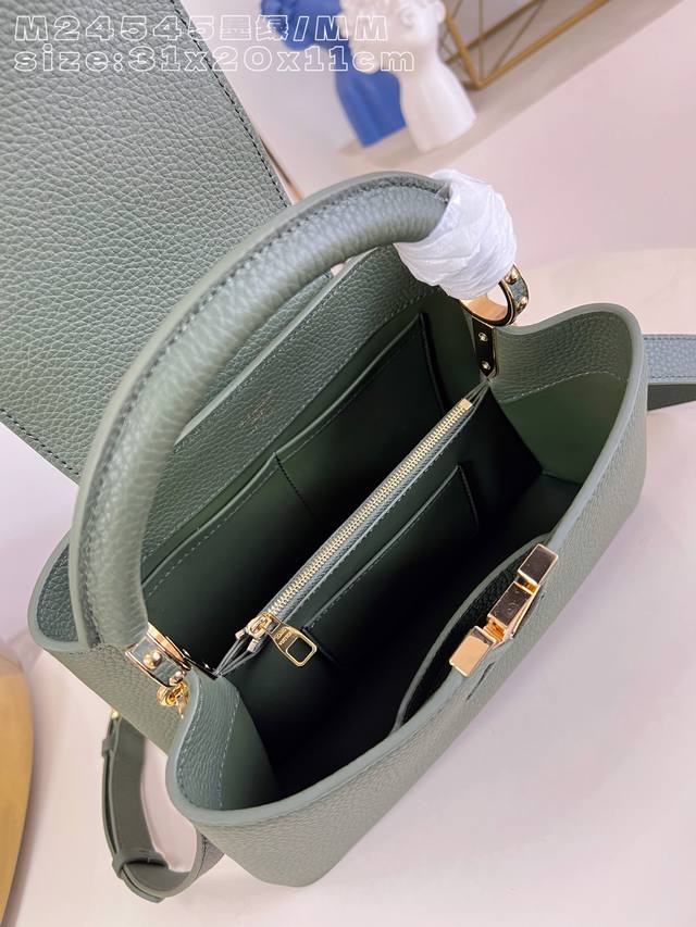 Factory Price p Top-tier original M24545 Dark Green Medium Capucines handbag. Launched in 2013, it is named after the Parisian street where Louis Vuitton first opened its store in 1854. Made of full-grain Taurillon calfskin with a classic flap: an exterior featuring a blooming Monogram flower, and an interior with a leather-covered LV logo. A compact size, measuring 31.05 x 20 x 11 cm (Length x Height x Width).