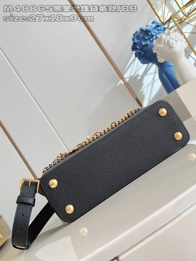 Factory Price p Top-Tier Original M48865 Black Gold Radiant Chain Small M26814 This modern Capucines BB is crafted from timeless black Taurillon leather and features a jewelry-inspired Infinity chain. The bag is adorned with double-galvanized metal hardware, including the iconic Monogram floral pattern and the LV Initials logo crafted with a sunburst finish, creating a sundial-like light and shadow effect. The bag has multiple pockets and a detachable shoulder strap, offering both shoulder and crossbody carrying options. 27 x 17.3 x 9 cm Length x Height x Width DDD