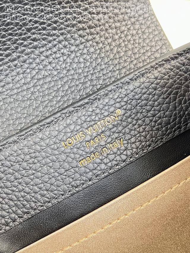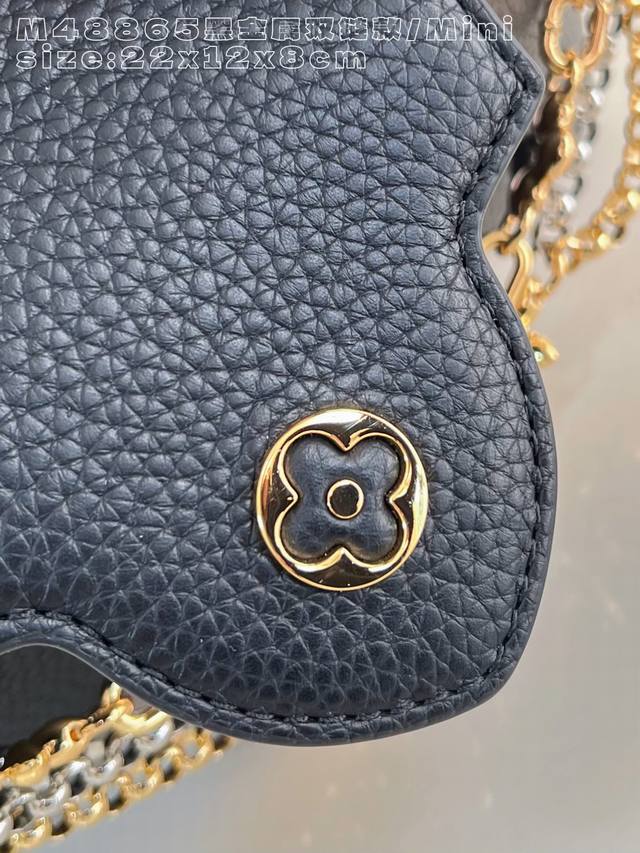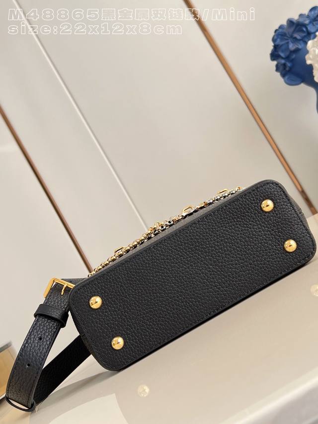 Factory Price p Top-tier original M48865 Black Metal Double Chain Mini Capucines East West Mini Handbag. Crafted from fine Taurillon cowhide leather, this miniature bag features a gleaming handle loop and the iconic LV logo, highlighting its petite design. The detachable shoulder strap allows for versatile shoulder or crossbody wear. 22 x 132 x 8 cm (Length x Height x Width)