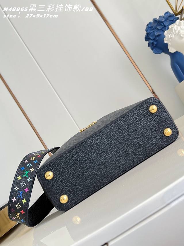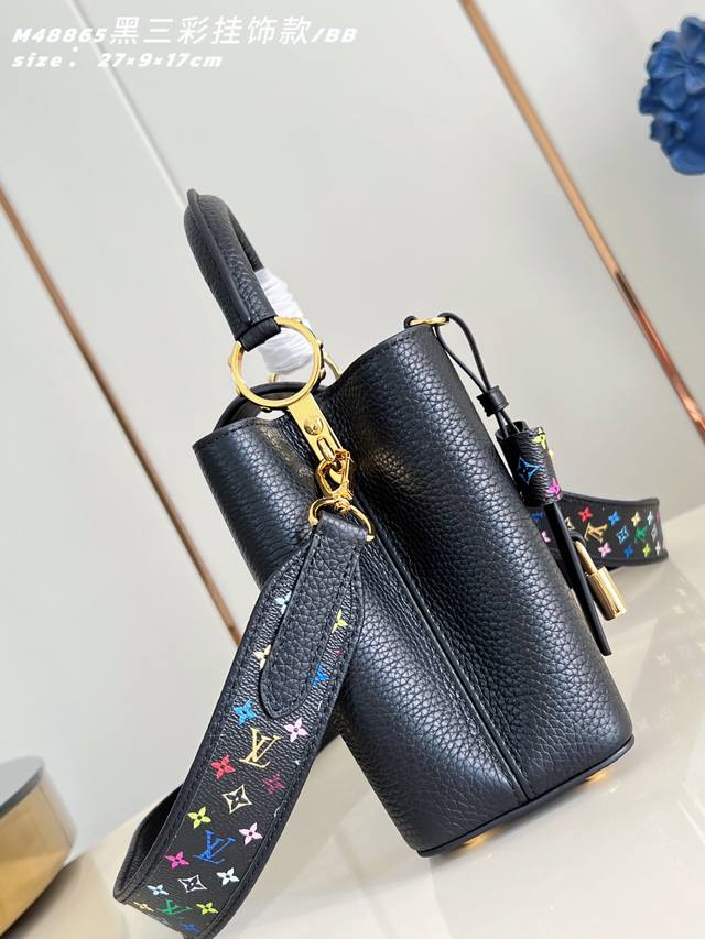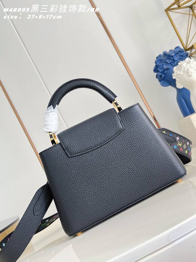 Factory Price p Top-tier original M48865 Black Tricolor Charm Small Capucines BB handbag. This Capucines BB handbag is from the Louis Vuitton x Takashi Murakami reissue series, using Taurillon calfskin leather to playfully reinterpret the classic design. Its dynamic style showcases the brand's exquisite craftsmanship. Shiny metal hardware and enamel LV lettering brighten the details of the Taurillon calfskin leather body, Monogram flowers adorn the detachable chain, and bright cherry embellishments add a touch of the new season. 17.3 x 9 x 27 cm (H x W x Length) DDD