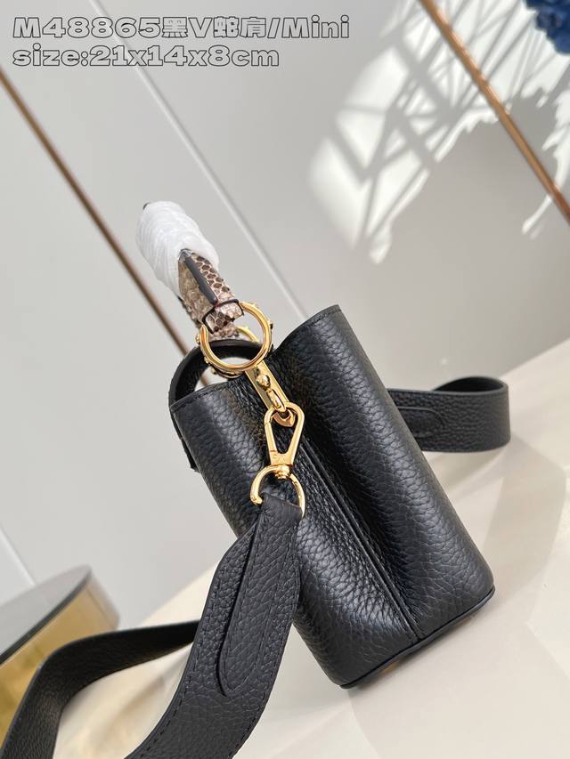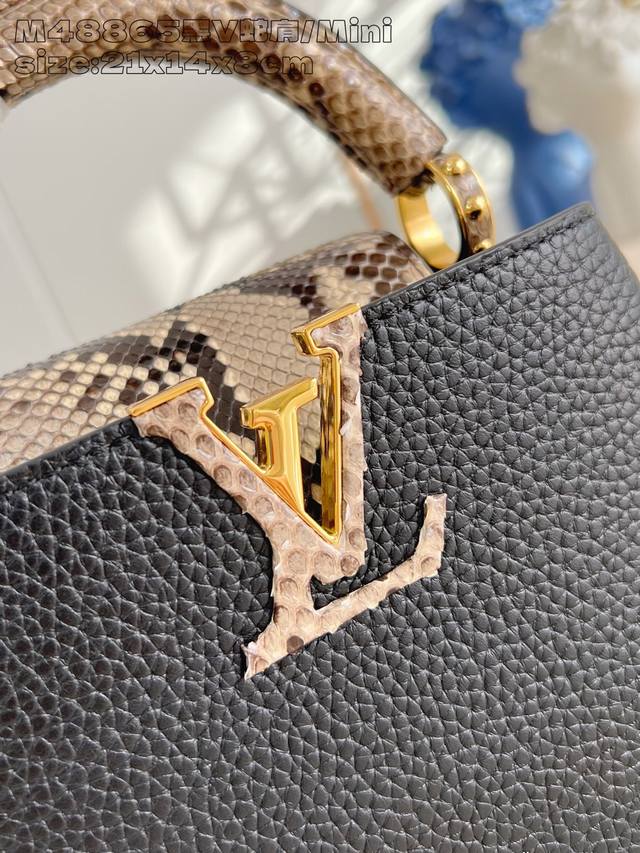 Factory Price p Top-Tier Original M48865 Black V Snake Shoulder Mini Capucines handbag. This Capucines mini handbag is crafted from deep-dyed Taurillon leather, with luxurious python leather wrapping the handles, flap, and LV logo. Whether carried by hand or over the shoulder using the detachable wide shoulder strap, it's perfect for any occasion. Size: 21X14X8Cm DDD