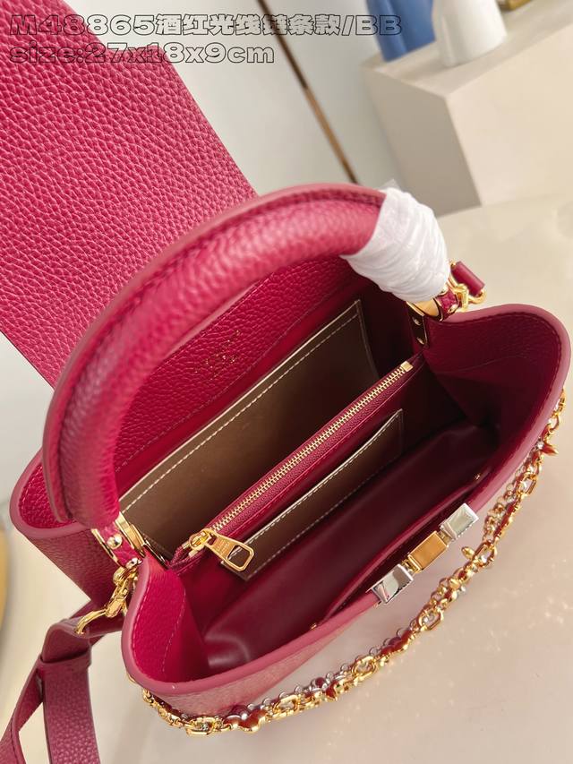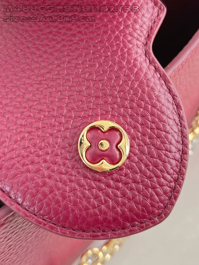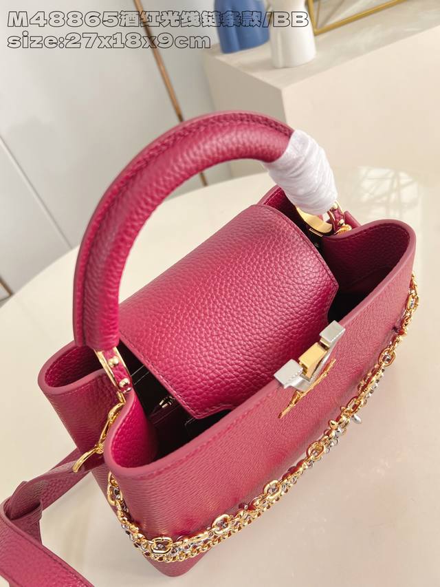 Factory Price p Top-Tier Original M48865 Burgundy Infinity Chain Small This modern Capucines BB is crafted from timeless black Taurillon leather and features a jewelry-inspired Infinity chain. The bag is adorned with double-galvanized metal hardware, including the iconic Monogram floral pattern and the LV Initials logo crafted with a sunburst finish, creating a sundial-like light and shadow effect. The bag has multiple pockets and a detachable shoulder strap, offering both shoulder and crossbody carrying options. 27 x 17.3 x 9 cm Length x Height x Width DDD
