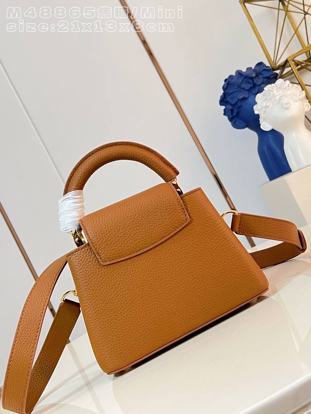 Factory Price p Top-tier original M48865 Caramel Mini Capucines mini handbag. This Capucines mini handbag is crafted from fine Taurillon cowhide leather, with glossy handles and the iconic LV logo highlighting its petite design. The detachable shoulder strap allows for versatile shoulder or crossbody wear. 21 x 13.6 x 8 cm (Length x Height x Width)