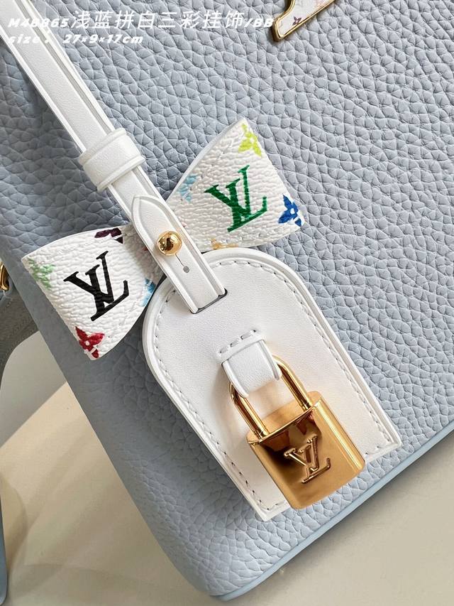 Factory Price p Top-Tier Original M48865 Light Blue and White Tricolor Charm Small Capucines BB handbag. This Capucines BB handbag is from the Louis Vuitton x Takashi Murakami reissue series, using Taurillon calfskin leather to playfully reinterpret the classic design. It showcases the brand's exquisite craftsmanship with a dynamic style. Shiny metal hardware and enamel LV lettering brighten the details of the Taurillon calfskin leather body, Monogram flowers adorn the detachable chain, and bright cherry embellishments add a touch of the new season. 17.3 x 9 x 27 cm (H x W x Length) DDD