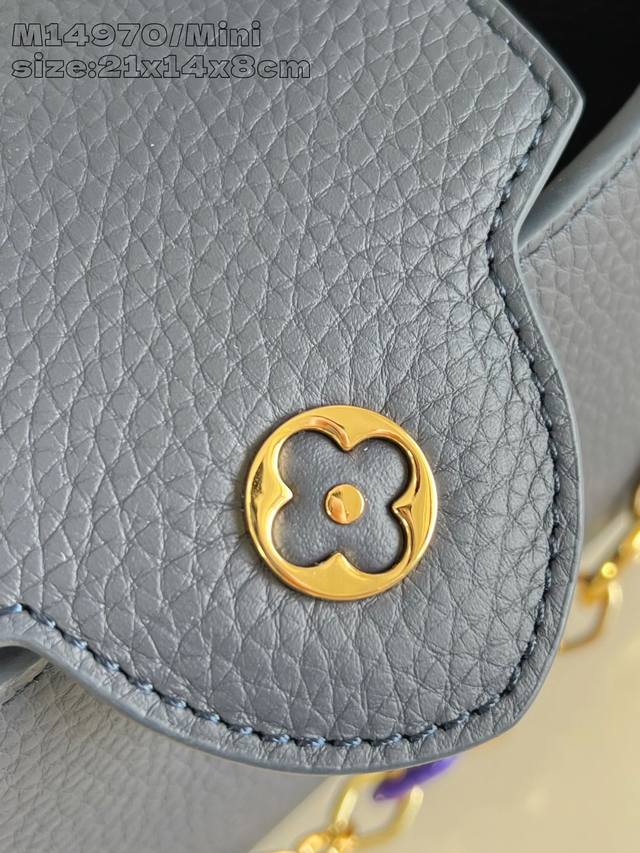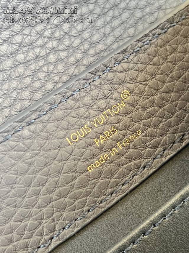 Factory Price: Premium Original M14970 Dark Blue Mini M14971. The Capucines Mini handbag, named after the Parisian street where Louis Vuitton first opened its store in 1854, is now a new addition to the Harmony collection. A jewel-like Monogram floral chain elegantly accents the Taurillon leather body. The ample interior easily accommodates a compact wallet, keys, lipstick, and other daily essentials. 14 x 8 x 21 cm (H x W x