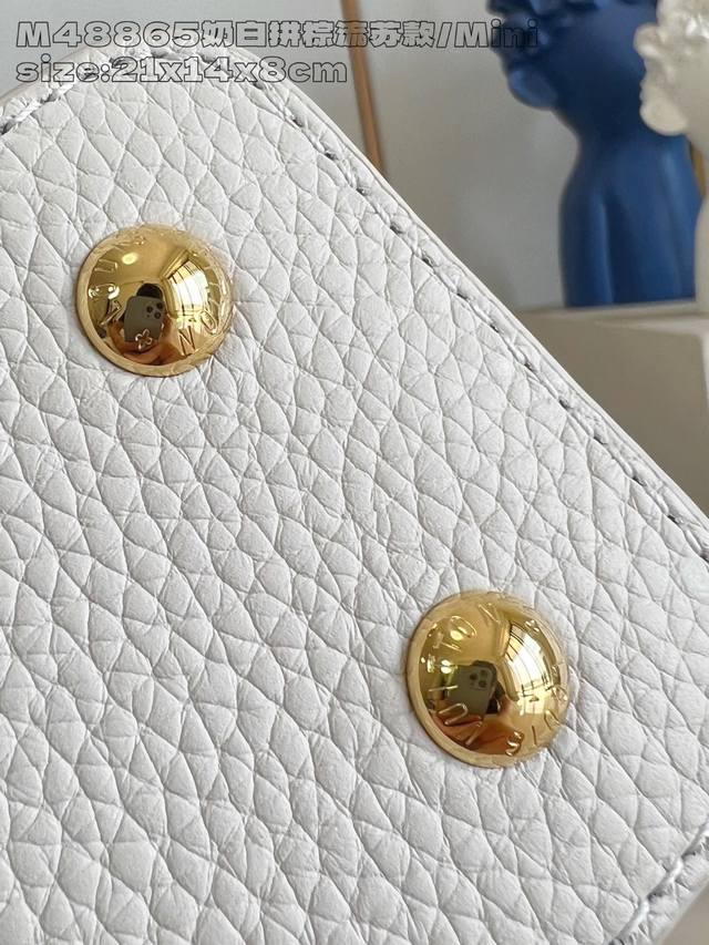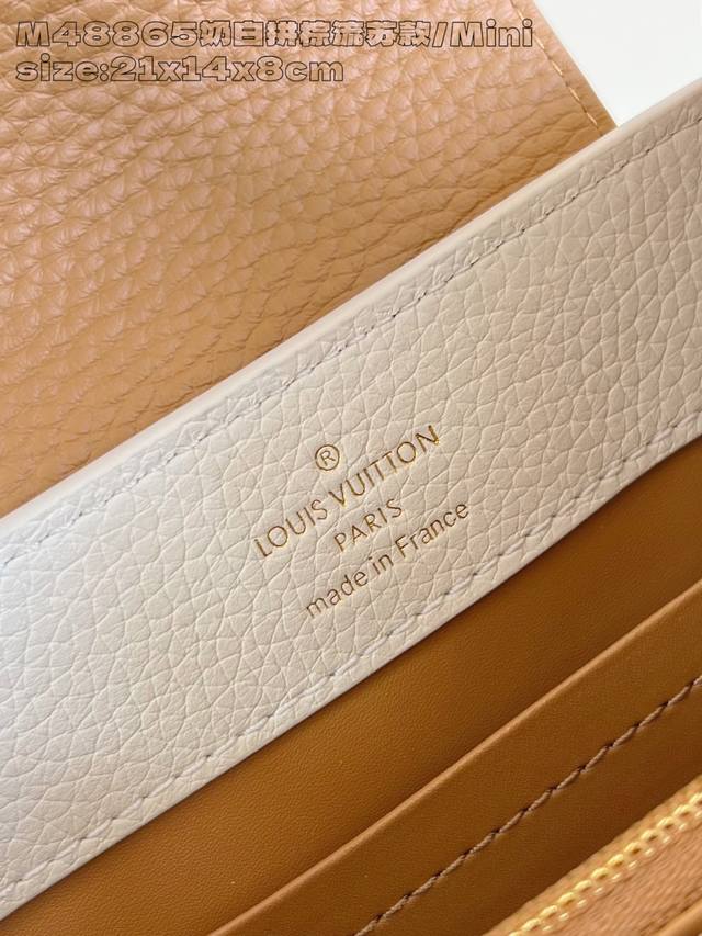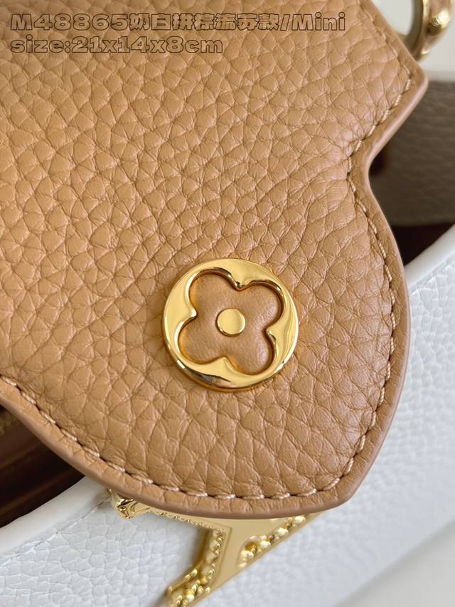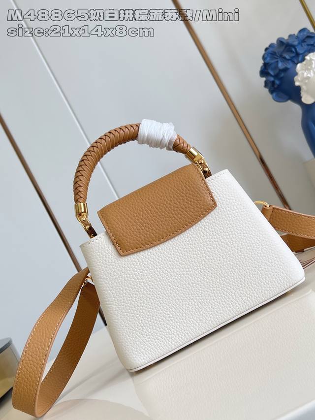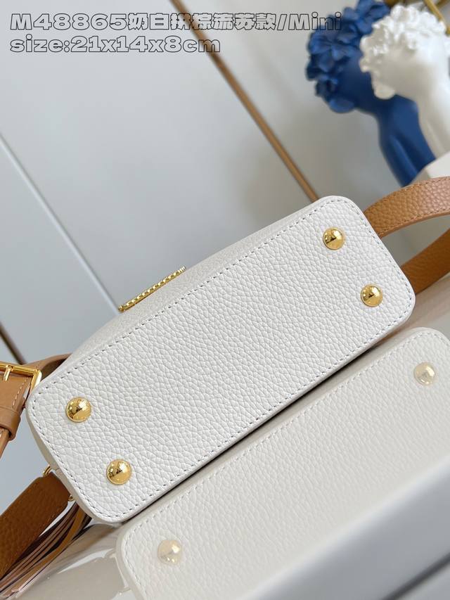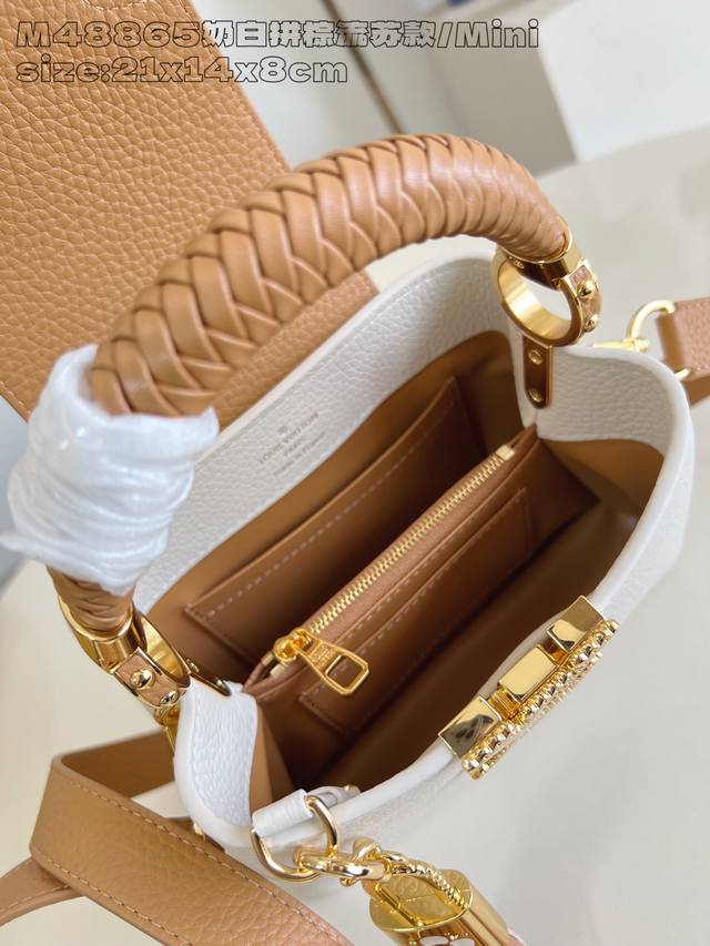 Factory Price: Premium Original M48865 Cream White and Brown Tassel Mini Crafty Collection Capucines mini handbags are once again imbued with the brilliance of craftsmanship. Taurillon cowhide leather creates a classic silhouette, while braided handles add a touch of sophistication. The Lv lettering is embossed, and a detachable tassel hangs below the padlock. 13.6 x 8 x 21 cm (H x W x