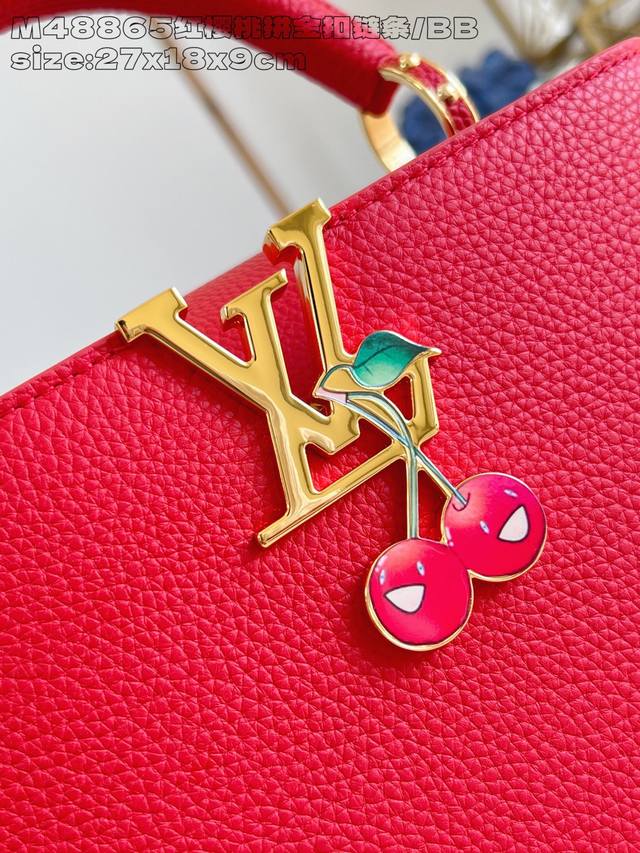 Factory Price: Premium Original M48865 Red Cherry with Gold Buckle and Chain, Small Size: M13250. This Capucines Bb handbag is crafted from fine Taurillon leather, featuring cherry motifs on the front and the Monogram denim interior pocket. This striking design captures the joyful spirit of the Louis Vuitton x Takashi Murakami collaboration. 17.3 x 9 x 27 cm (H x W x D) N.1350