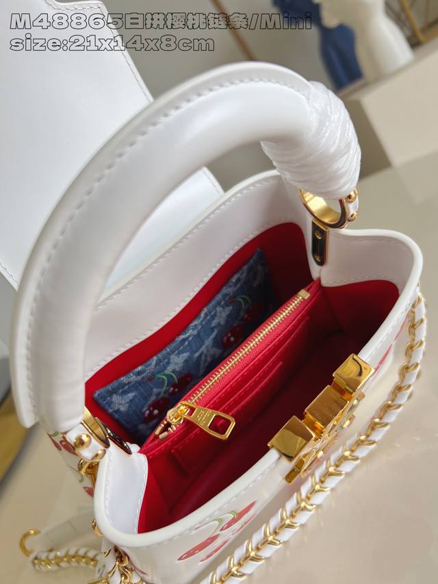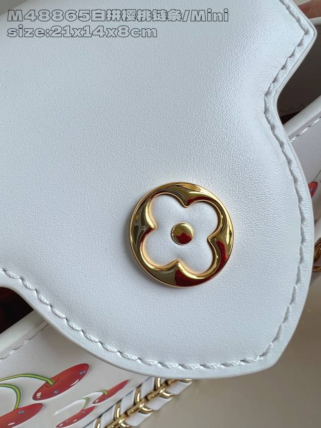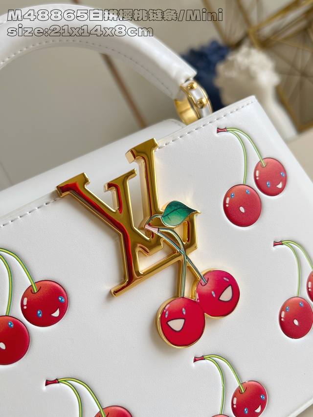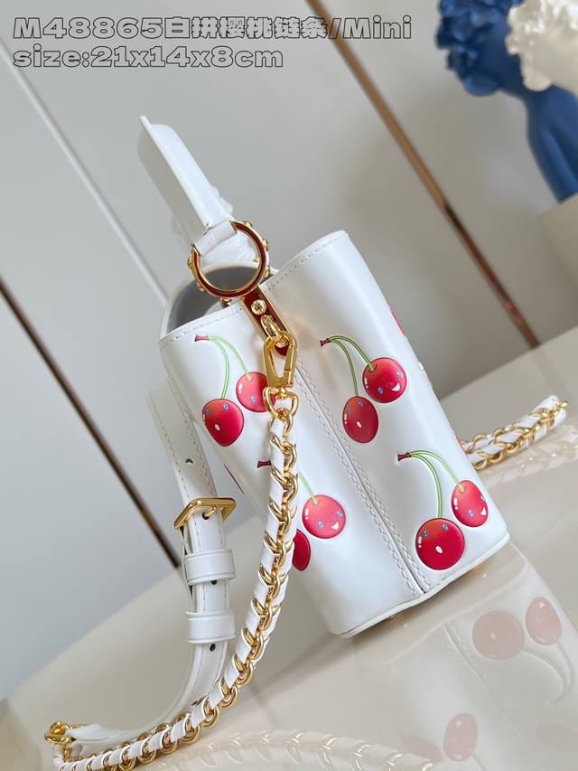 Factory Price: Premium Original M48865 White Cherry Chain Mini M13251. This Capucines mini handbag embodies the trendy spirit of the Louis Vuitton x Takashi Murakami collection with a summery flair. The vibrant cherry embossed pattern on the cowhide leather subtly highlights the Japanese artist's signature brushstrokes. The metal hardware and the Lv lettering on the front shimmer with a subtle luster. 13.6 x 8 x 21 cm (H x W x