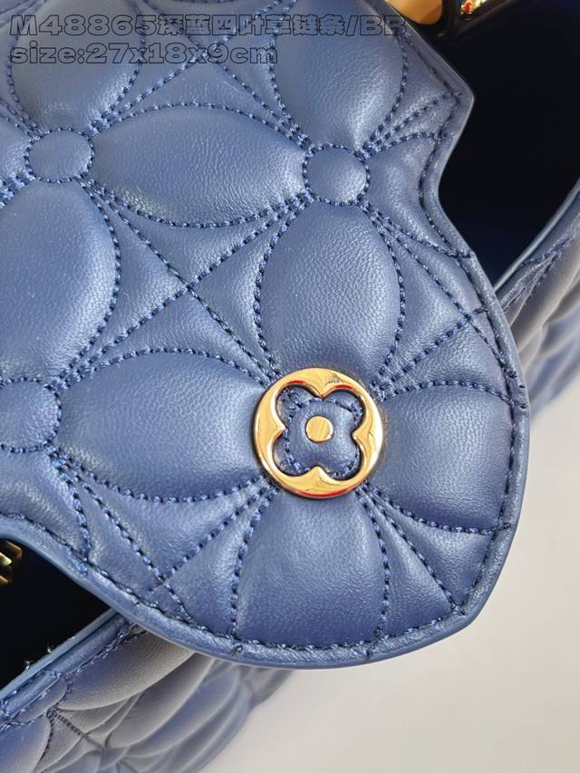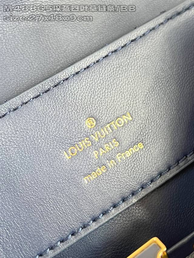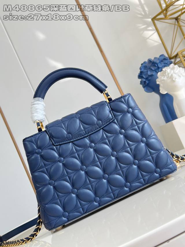 Factory Price: Top-Quality Original M48865 Dark Blue Clover Chain Small. This Capucines Bb handbag is crafted from delicate Taurillon leather, featuring a shimmering handle and the iconic Lv logo, emphasizing its compact silhouette. The detachable shoulder strap allows for seamless shoulder or crossbody carry. Dimensions: 17.3 x 9 x 27 cm (H x W x L)