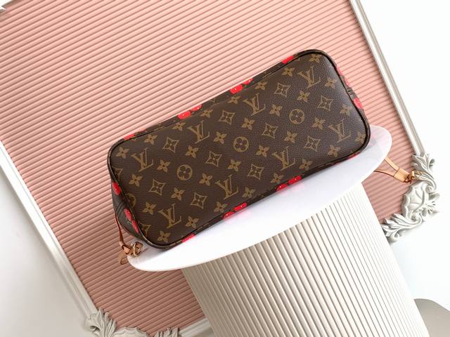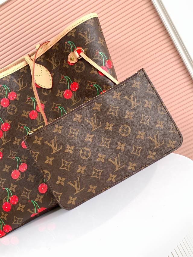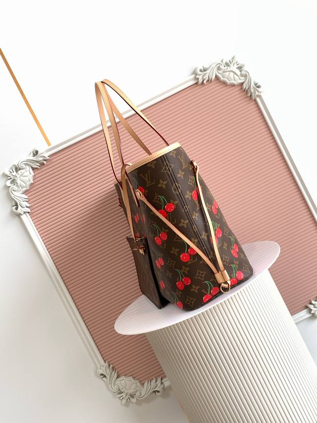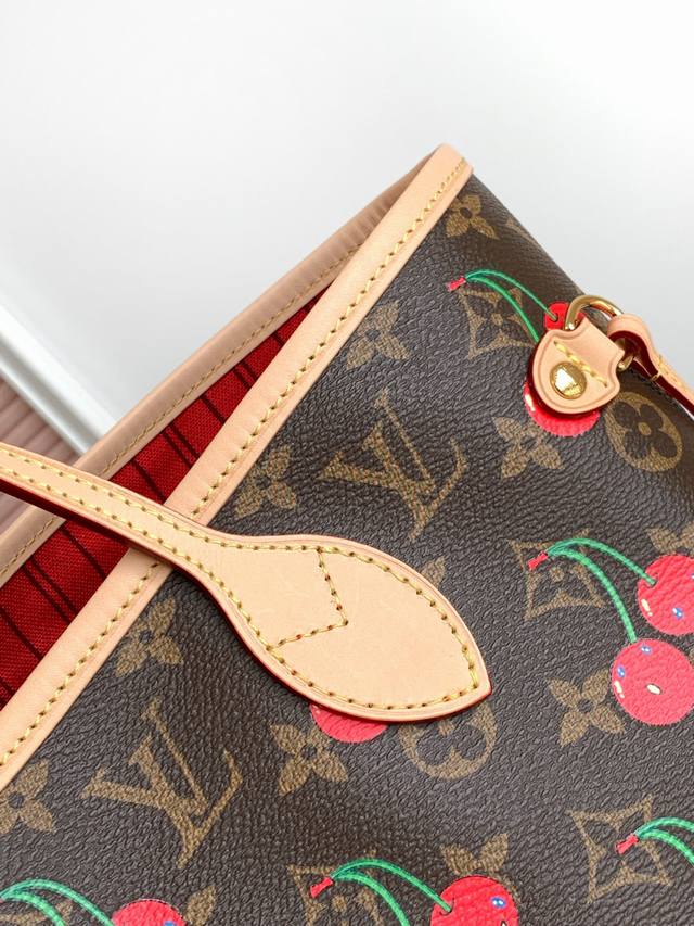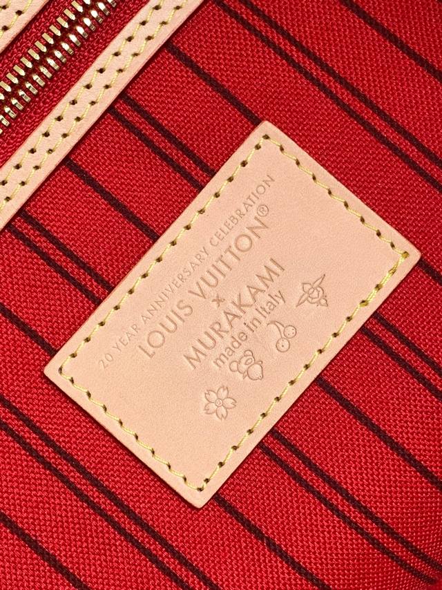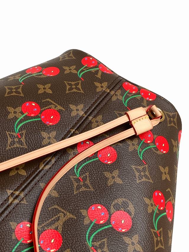 This Neverfull medium handbag reinterprets the joyful elements of the Louis Vuitton x Takashi Murakami reissue collection with a dynamic brushstroke. A sweet cherry motif nestles on Monogram coated canvas, while a striking striped lining embodies the artist's signature color aesthetic. Cowhide leather trim completes the classic style.