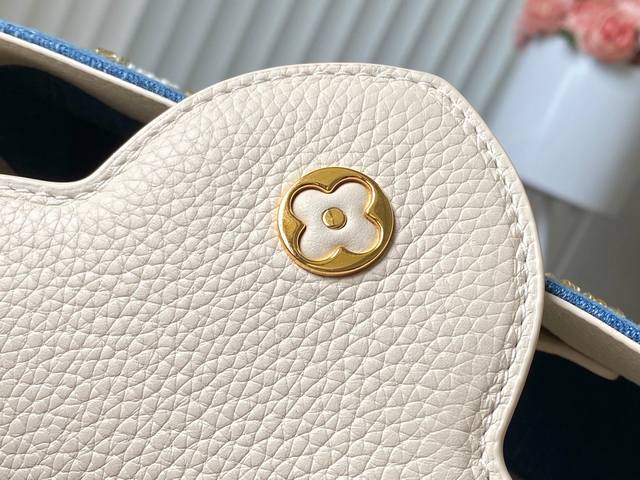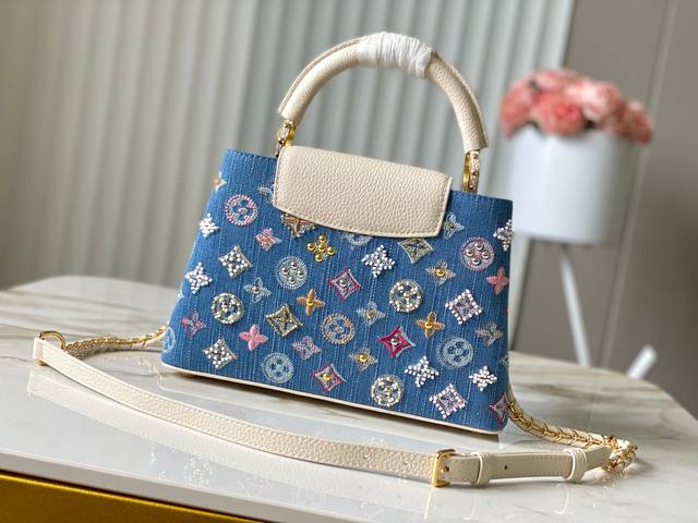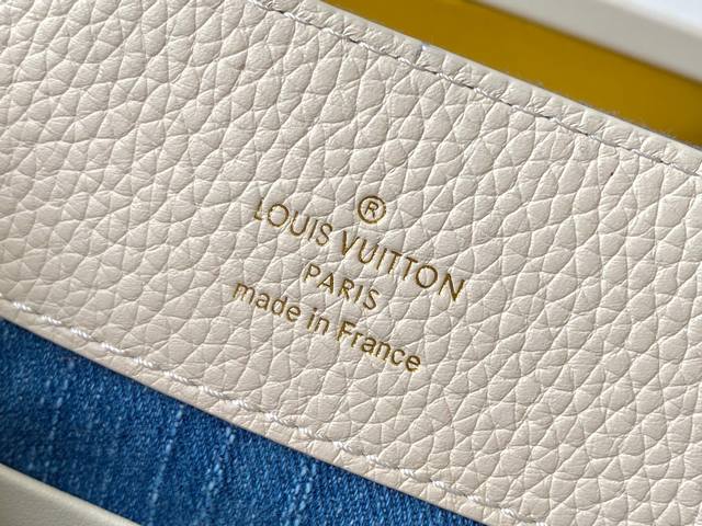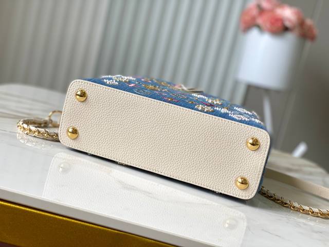 Genuine raw material dynamic chip M12947 M48865 cream white denim floral embroidery. This Capucines handbag is made of Monogram denim, embroidered with beads and decorative thread, and the Lv monogram and braided chain add a metallic edge. It is trimmed with contrasting leather. The flap can be folded in or out to neaten the interior and provide multiple carrying options for perfect functional details. Size: 27 * 18 * 9 cm