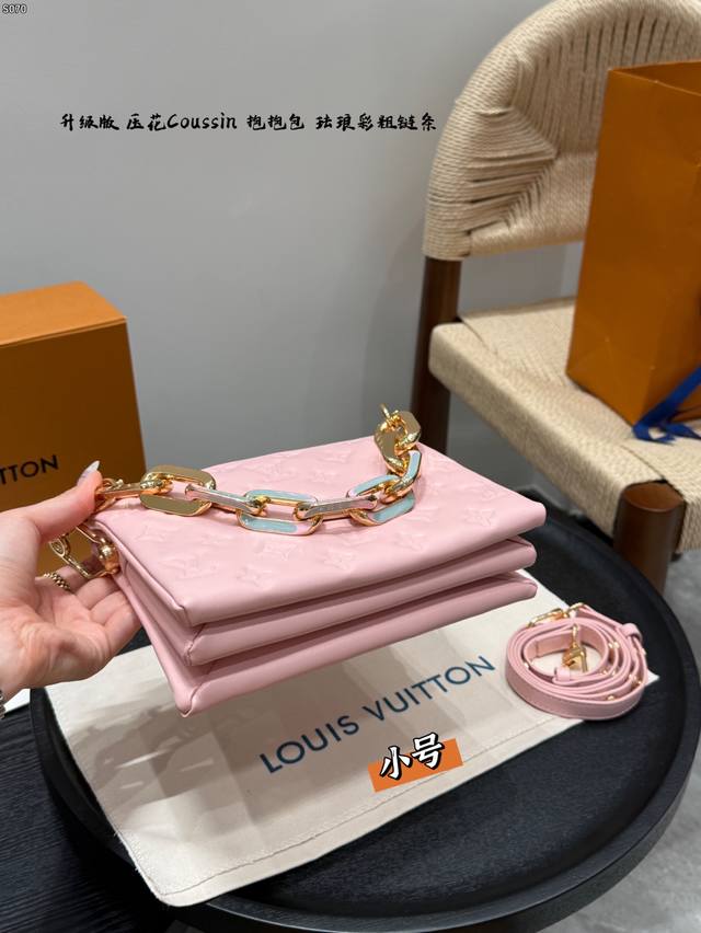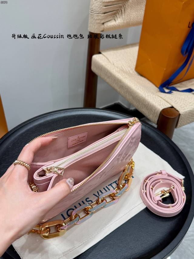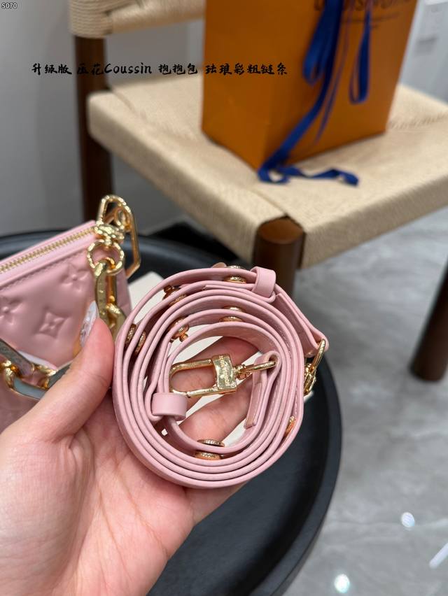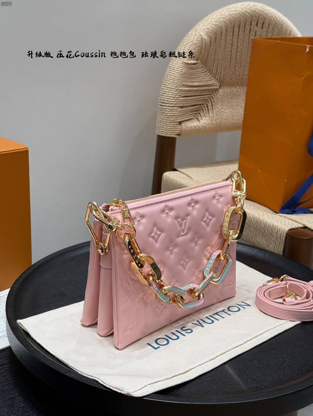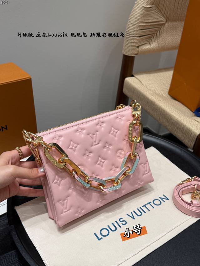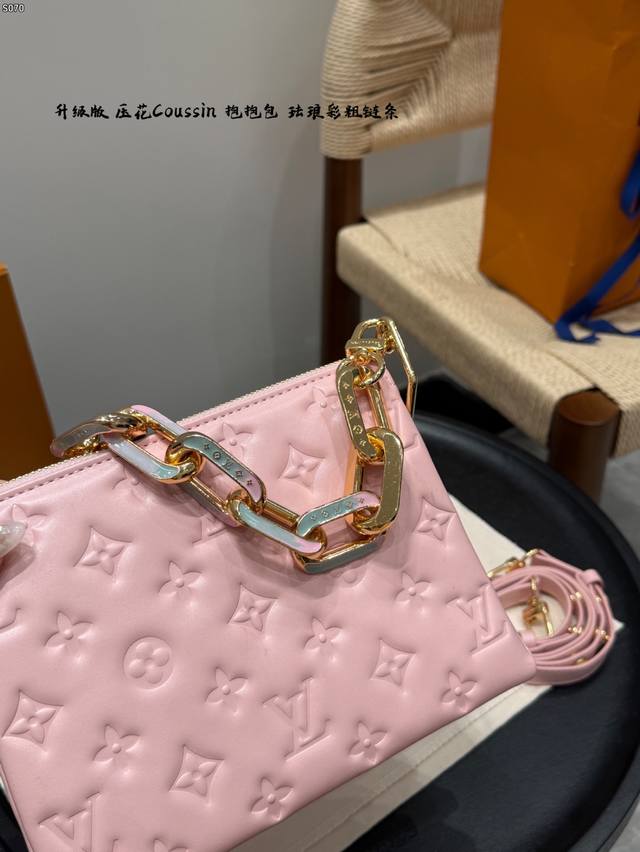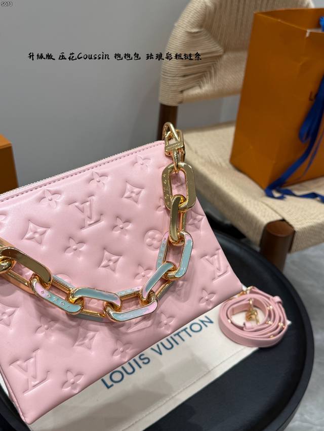 Lv Coussin cuddle bag with thick chain in a new enamel colorway. The
