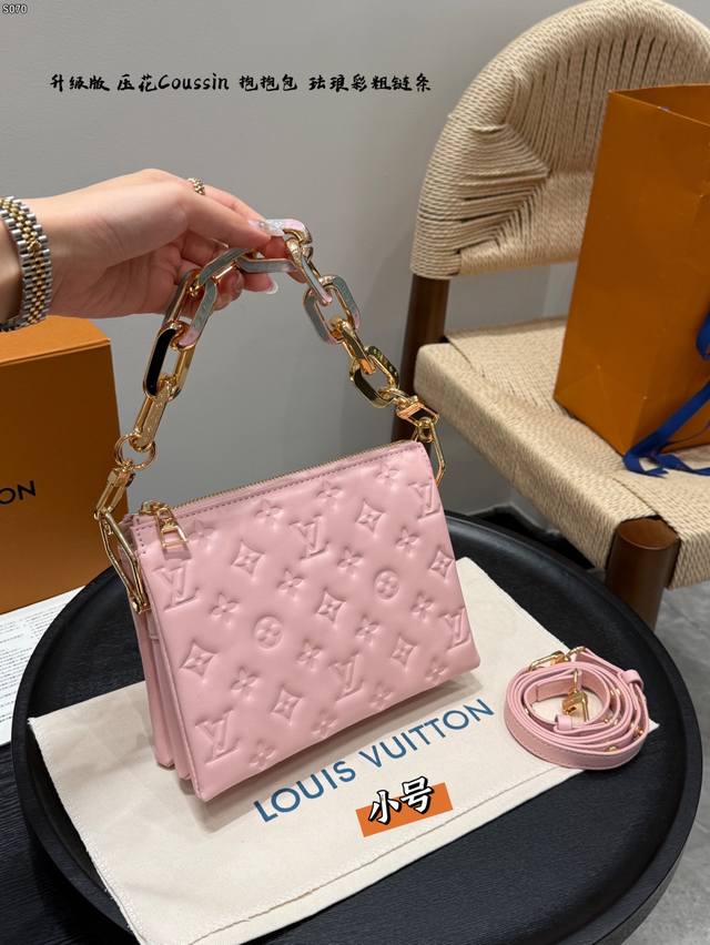 Coussin handbag, crafted from fluffy lambskin leather embossed with a Monogram pattern, offers a soft, compact design. Interior compartments add functionality, making it suitable for both day and night, a must-have for celebrities. Both the thick chain and the slender leather shoulder strap are removable, offering a variety of styling options.