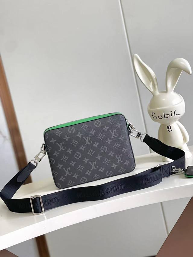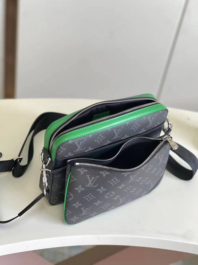 Haiyuan Outer Single Real Home Shoot Dynamic Chip M12490 Gray M12766 Green M26052 Green New Men's Bag Three-piece Messenger Bag Series This Trio Messenger Bag is a three-in-one design with Monogram Eclipse Reverse canvas and eye-catching details. The zipper front pocket and the coin purse at the shoulder strap are both detachable, enriching the functional design with the main bag. The adjustable and detachable fabric shoulder strap is embellished with the Louis Vuitton logo, providing a comfortable shoulder experience.