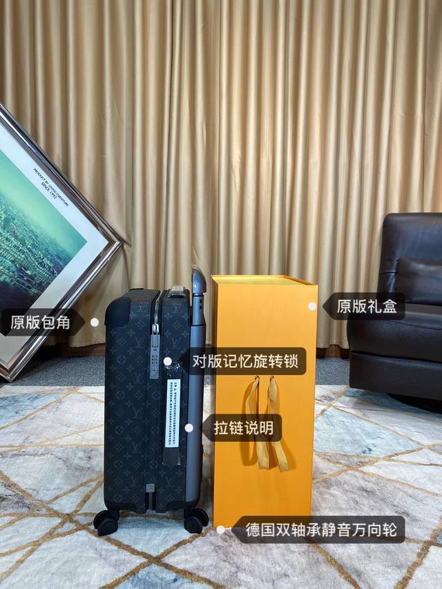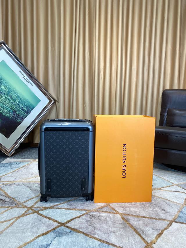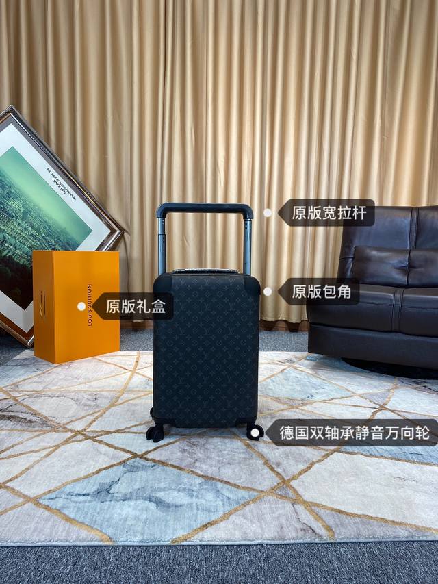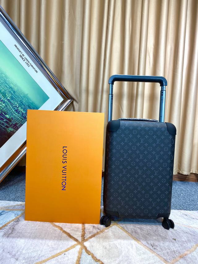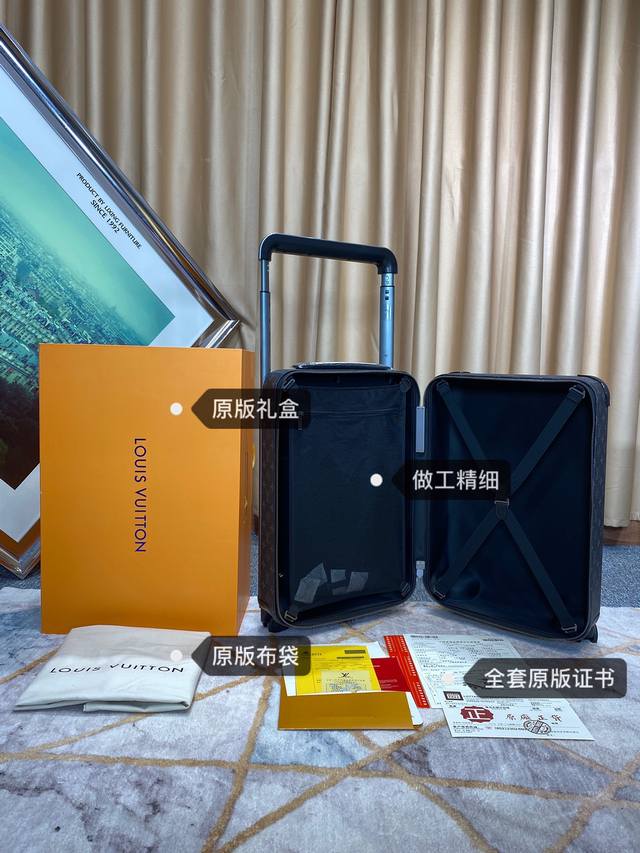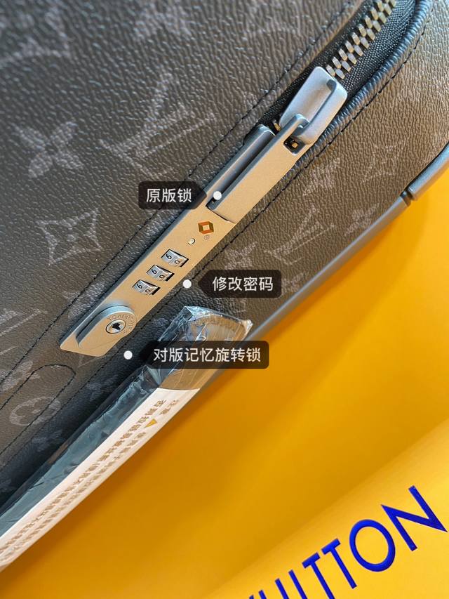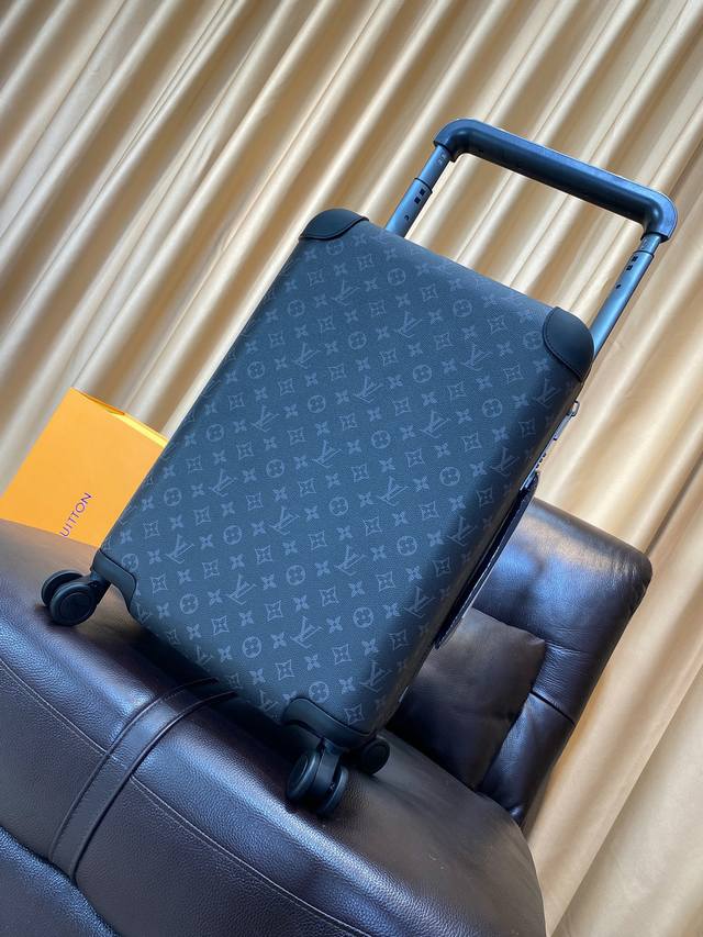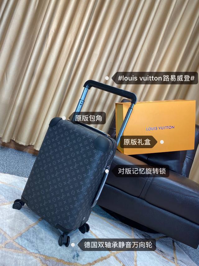 Material design: Exterior made of Louis Vuitton's special coated canvas, natural cowhide trim, metal hardware, large external trolley handle, flat interior bottom design, leather corners, zipper closure, padlock, and 4 compact wheels!