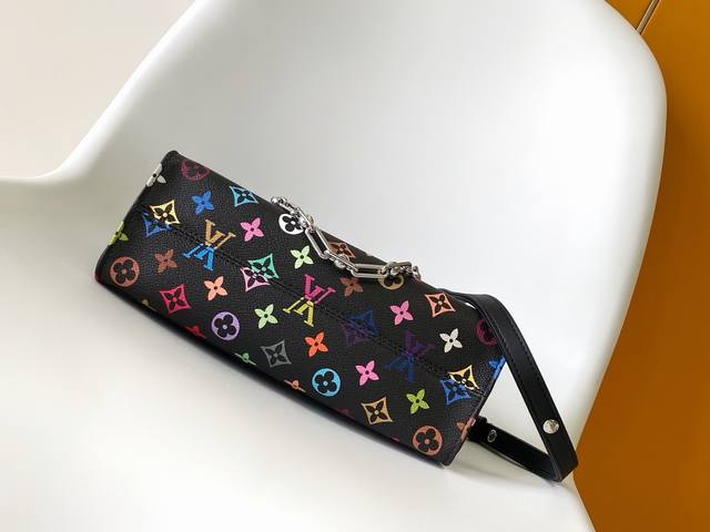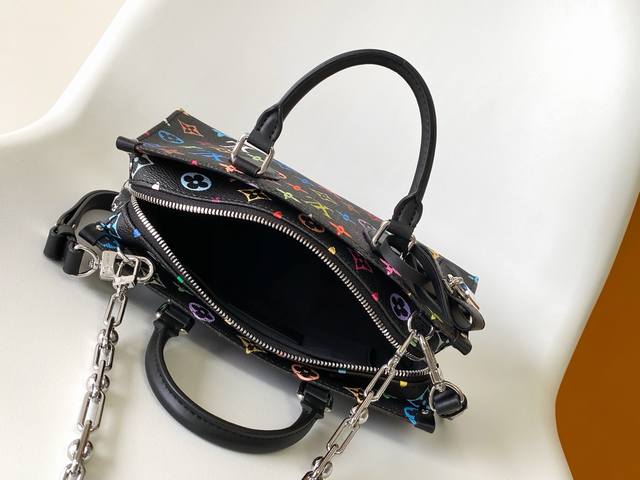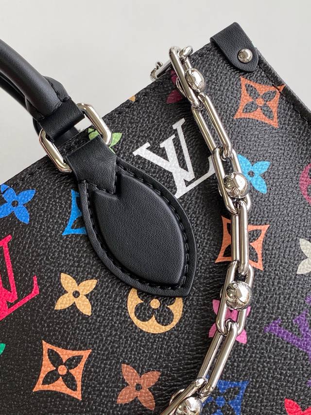M13260 Black Dynamic Chip Square Chain Bag LV X Tm Onthego East West Chain Handbag. This Onthego East West handbag is crafted from coated canvas and features a full Monogram pattern in rainbow hues from the Louis Vuitton x Takashi Murakami collaboration. The calfskin Toron handle, crossbody chain, and adjustable leather shoulder strap allow for multiple carrying options. The spacious interior easily accommodates everyday essentials such as a smartphone. Dimensions: 25 x 13 x 10 cm.