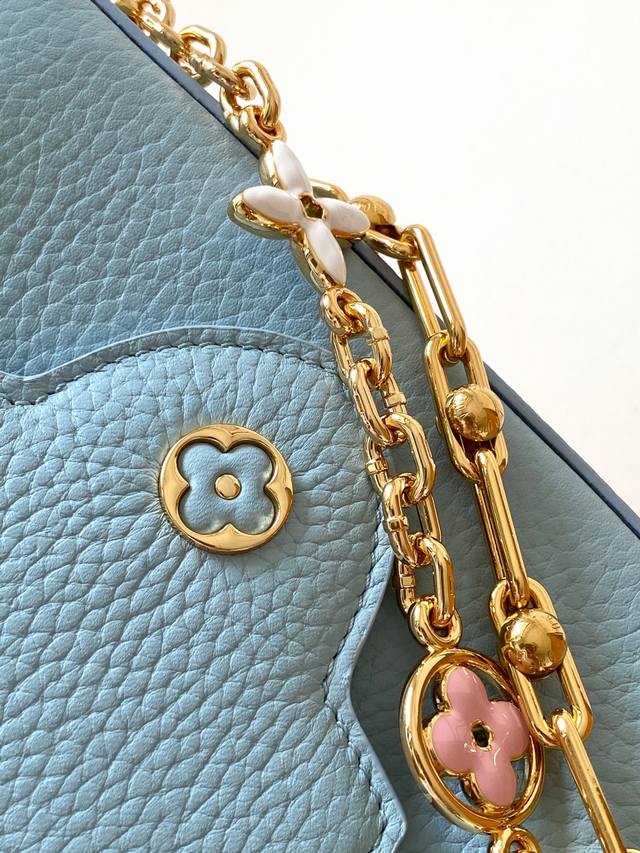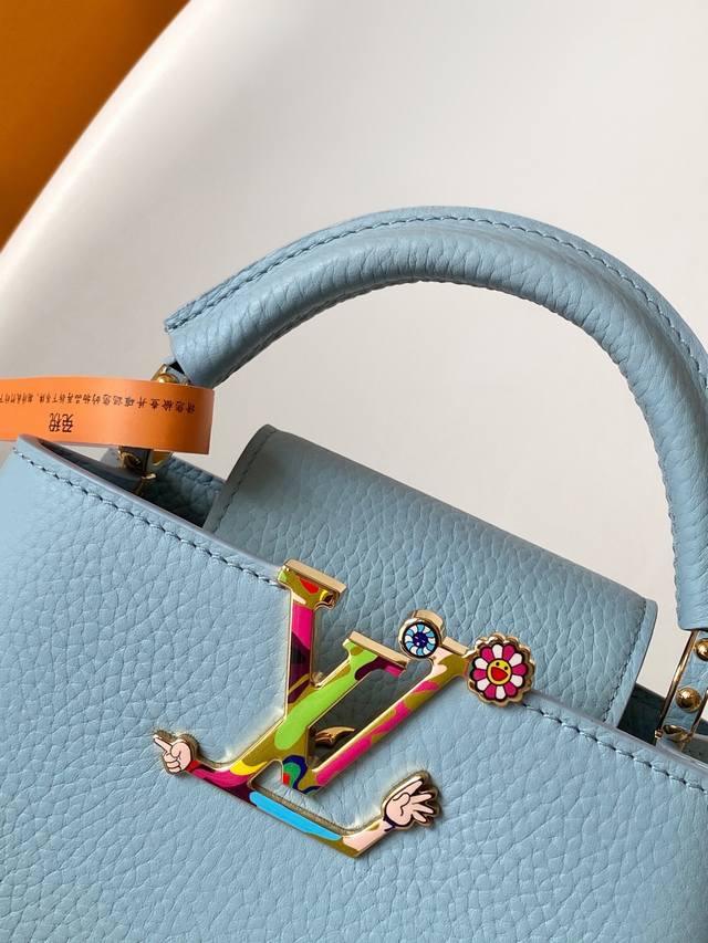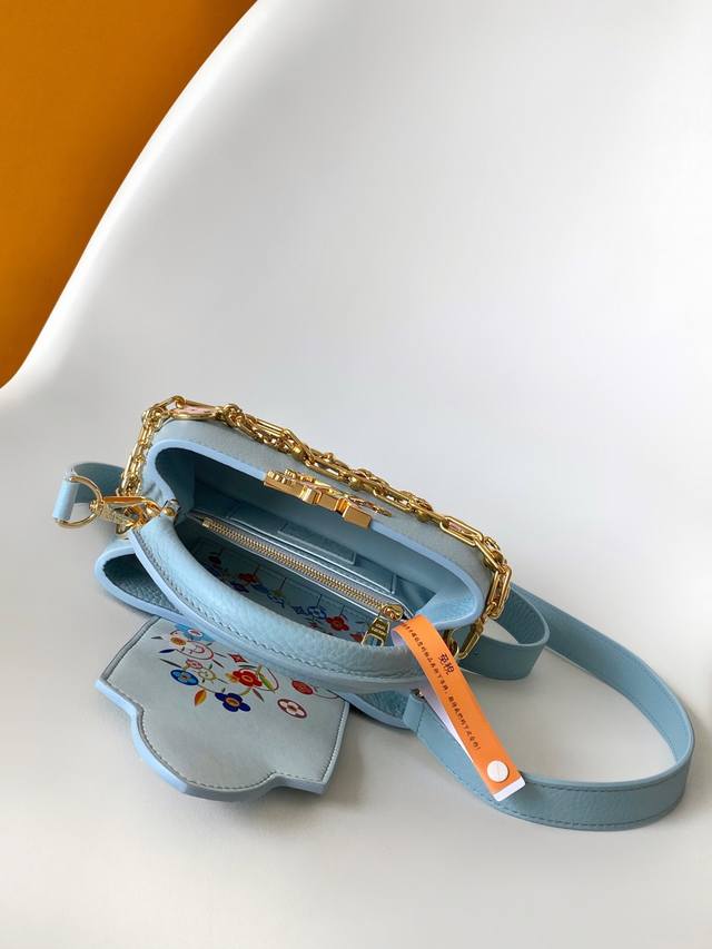 M13707 Premium Original Factory Dynamics 163 This Capucines East West Mini tote bag is a remarkable piece transformed from the playful code of the Louis Vuitton X Murakami reissue. It's crafted from light blue Taurilon leather, a color inspired by Murakami Takashi's original rainbow palette. The iconic LV initials and Monogram flower on the front elevate the chain, which has been originally redesigned in the artist's signature Superflat style. DDD 22 X 12 X 8 cm Ddd Length X Height X Width Ddd Blue Olympus Ddd Cuittorilon Ddd Cowhide Lining Ddd Cowhide Leather Lining Ddd Gold Metallic Ddd Dual Loading Options: Lined or Outer Lined Ddd Internal Compartment Ddd Internal Pocket with Zipper Ddd Internal Pocket Ddd Four Metal Protective Feet Ddd May Include: Smartphone, Compact Wallet Ddd Shoulder Strap: Detachable, Adjustable Ddd Shoulder Strap Length: 46.5 cm Ddd Maximum Shoulder Strap Length: 54.0 cm Ddd Handle: Simple DDD