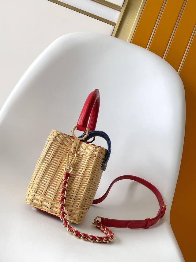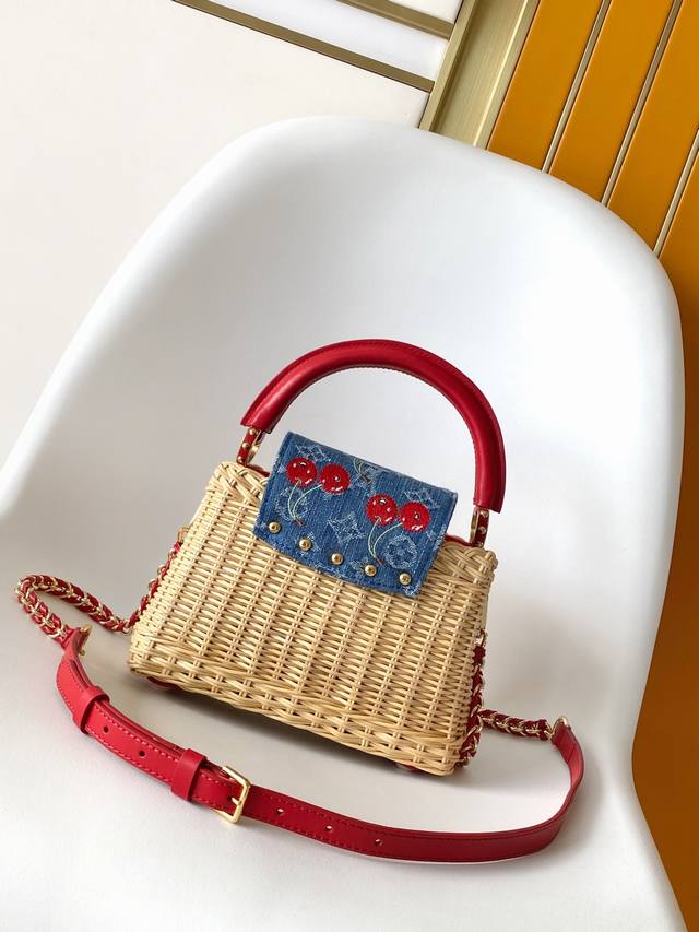 M14295 Premium Original Factory Dynamic 163 This Capucines mini handbag encounters striking details from the Louis Vuitton x Takashi Murakami reissue series, highlighting a trendy style with fresh elements. The rattan body complements the handles, woven shoulder strap, and LV logo, while the top flap is delicately adorned with a cherry pattern. 21.0 x 13.6 x 8.0 cm (Length x Height x Width)