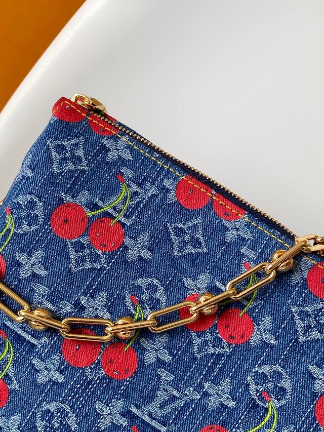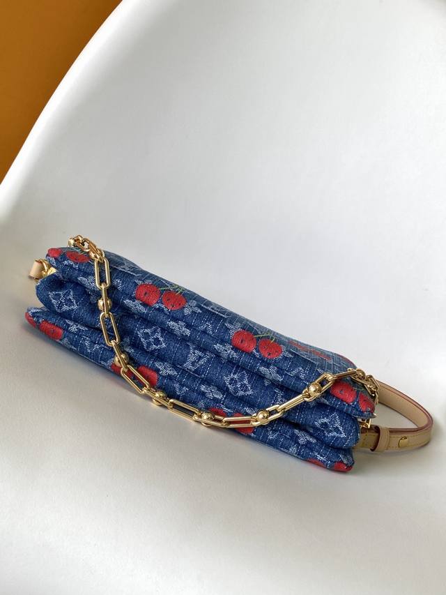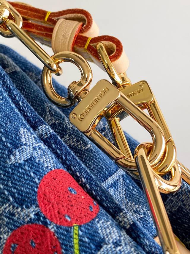 M14978 Top-tier original single item, dynamic 163. This Coussin small handbag is from the Louis Vuitton x Takashi Murakami reissue series. It features a Monogram denim fabric embroidered with vibrant cherry patterns, showcasing the playful artistic touch of the Japanese artist. A detachable chain and adjustable leather shoulder strap allow for flexible carrying, and ample space can accommodate everyday essentials such as a smartphone. 26.0 x 20.0 x 12.0 cm (Length x Height x Width).