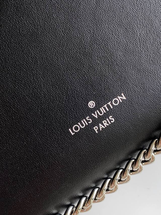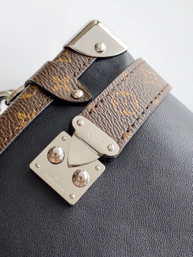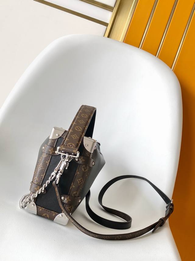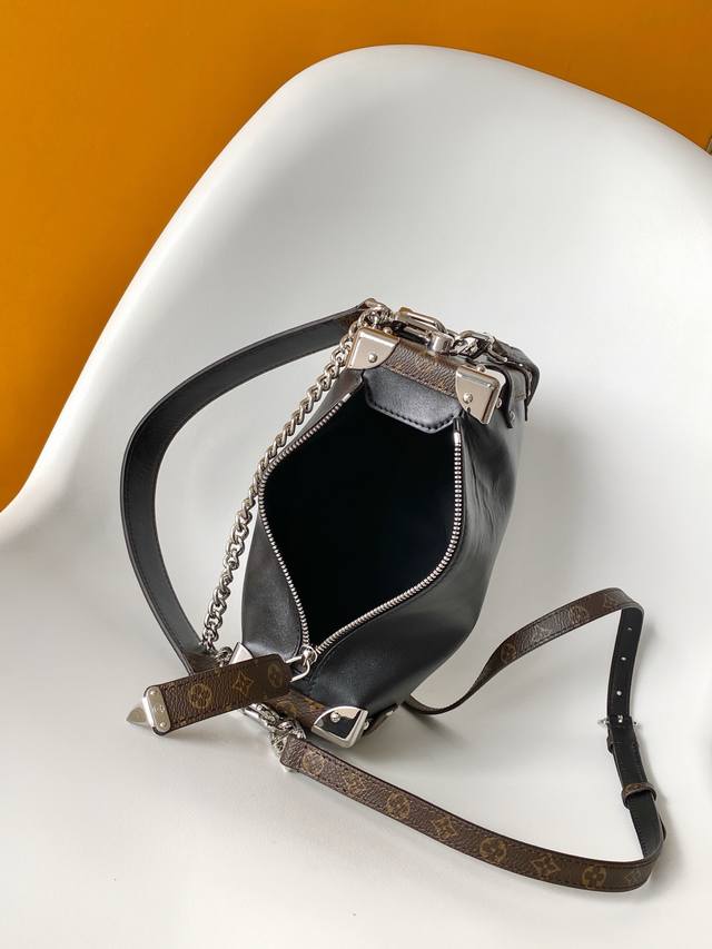 M15195 Top-tier original single item, dynamic design. This Side Trunk Vibe handbag reimagines the classic Side Trunk silhouette with an avant-garde design, inspired by Louis Vuitton's traditional travel trunks. Crafted from smooth, glossy Vibe-textured cowhide, it features a leather-covered studded frame and a metal S-Lock clasp, exuding a rock-and-roll style. Multiple carrying options are available thanks to the detachable chain, detachable leather handles, and adjustable leather shoulder strap. 23.5 x 16.0 x 8.5 cm (Length x Height x Width).