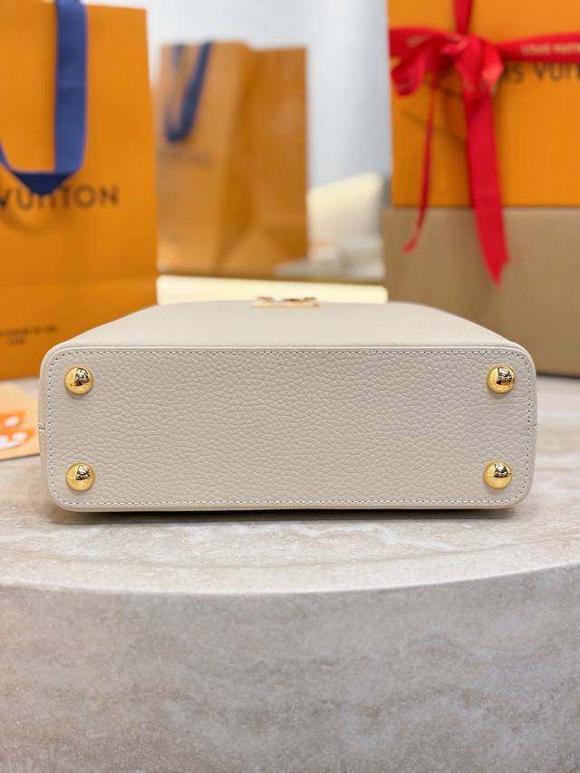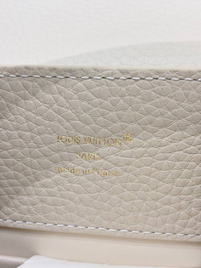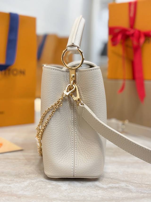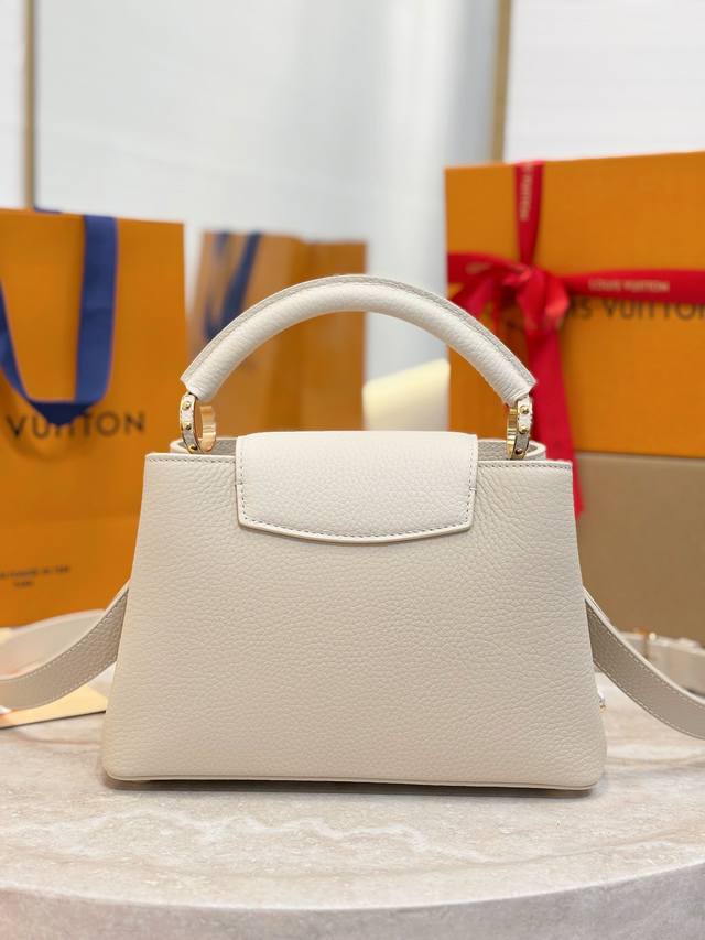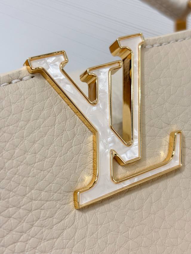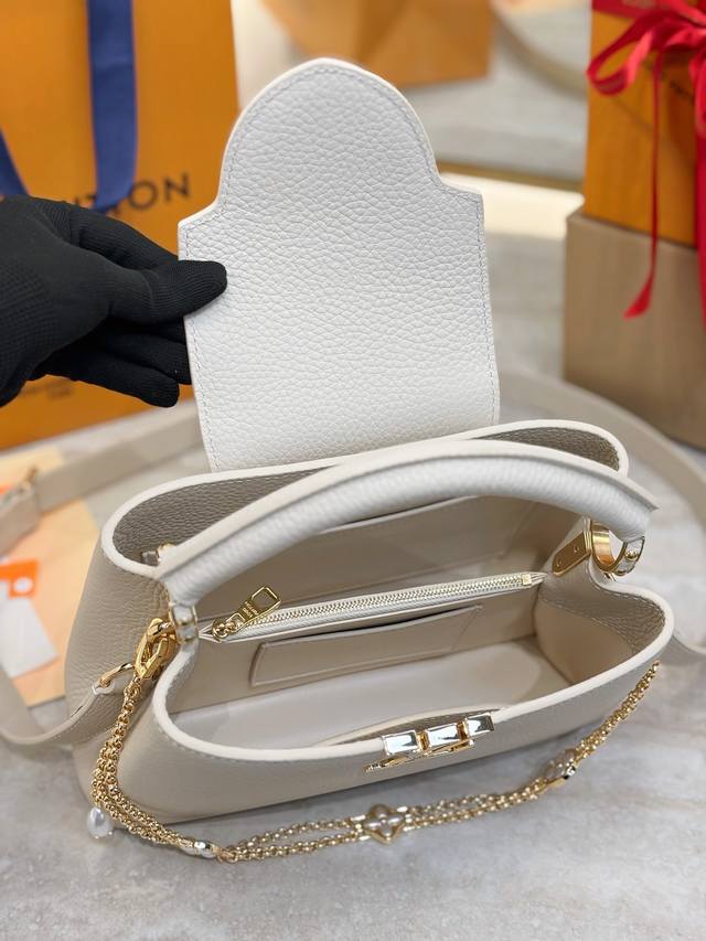 M25862 DDD Beige/Off-white Small Size 27cm DDD This Capucines BB handbag is from the Daydream collection, rendered in an elegant tone by Taurillon calfskin, subtly paying homage to the classic shell necklace. Monogram flowers illuminate the Baroque-style chain, while the LV logo and lustrous beads add a touch of brilliance. DDD Size: 19X9X27cm DDD