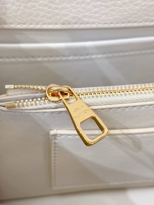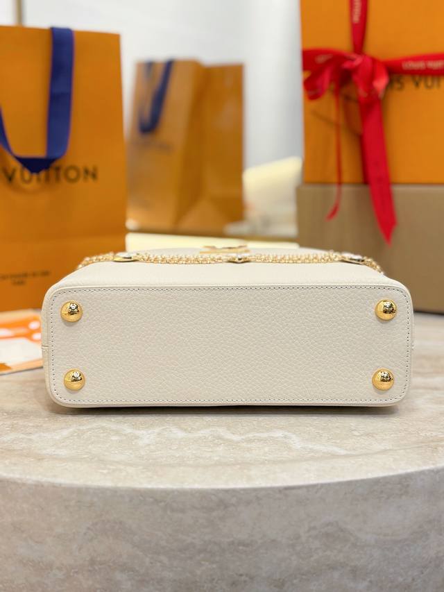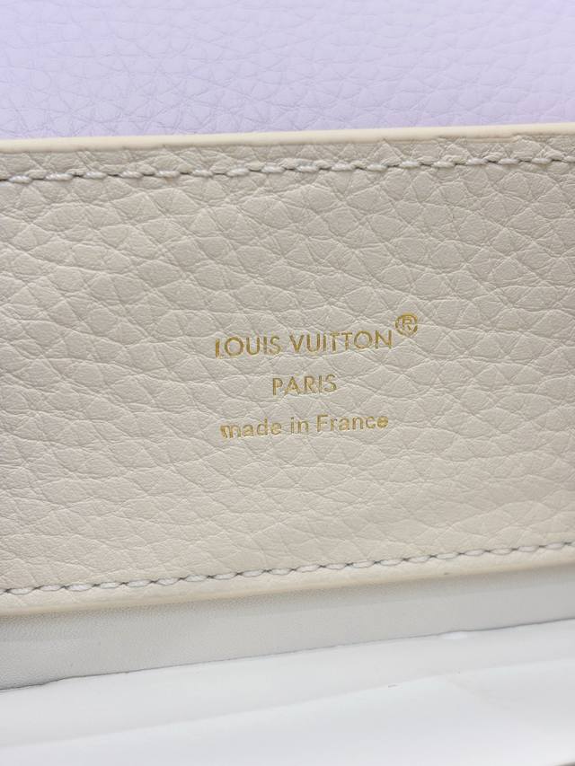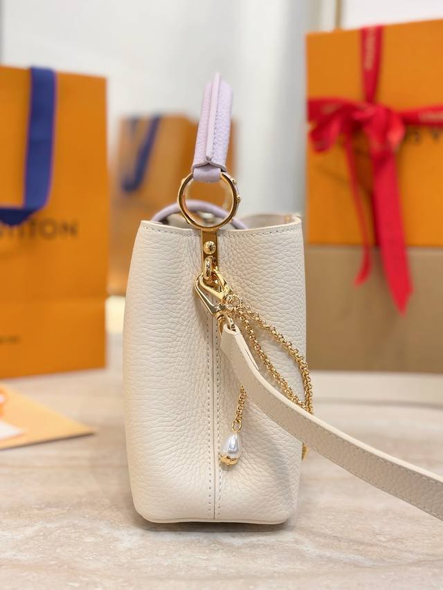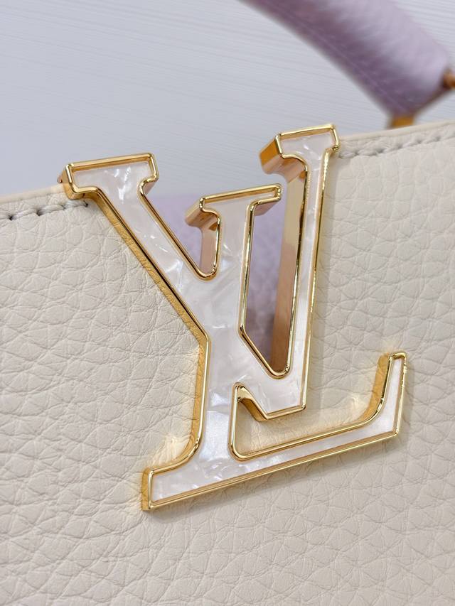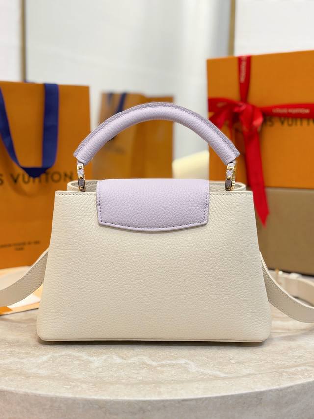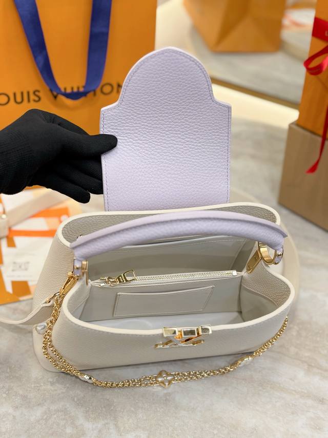 M25862 DDD Small 27cm in off-white and taro purple DDD This Capucines BB handbag is from the Daydream collection, rendered in an elegant hue of Taurillon calfskin, subtly paying homage to the classic shell necklace. Monogram flowers illuminate the Baroque-style chain, while the LV logo and lustrous beads add a touch of brilliance. DDD Size: 19X9X27Cm DDD