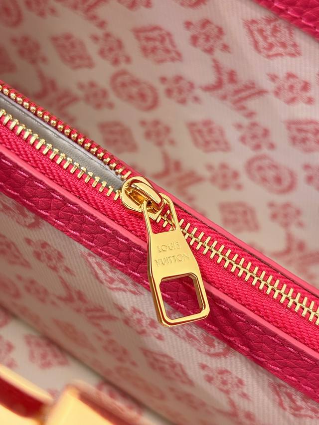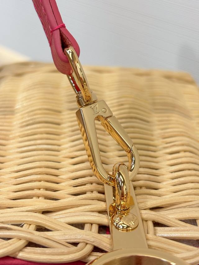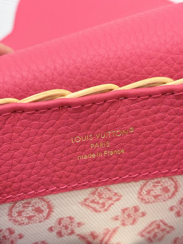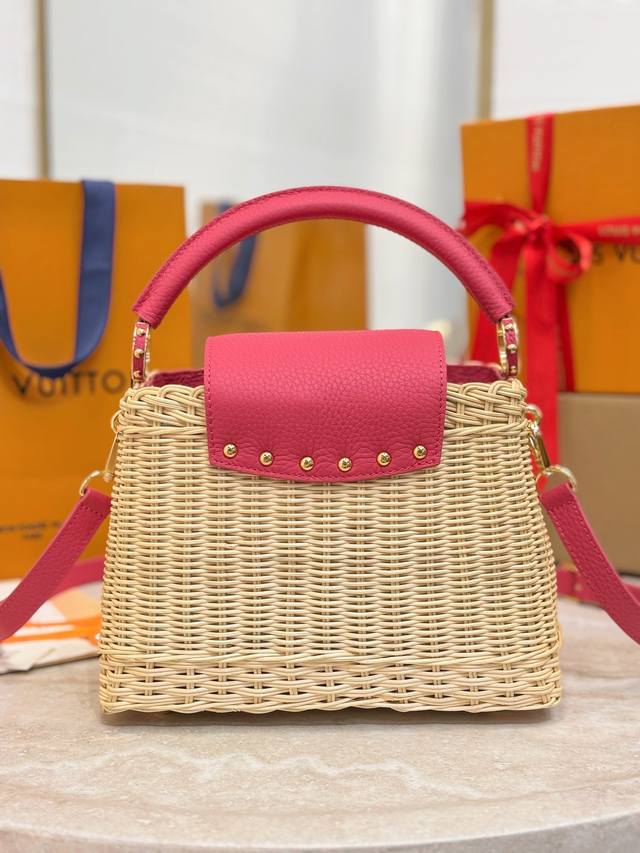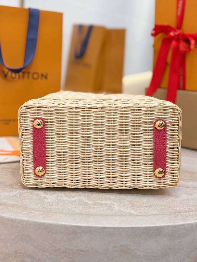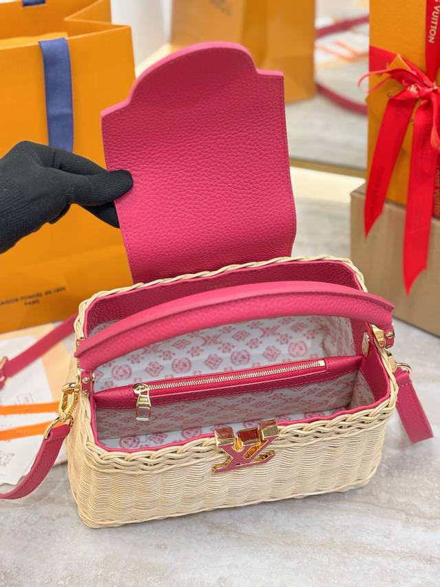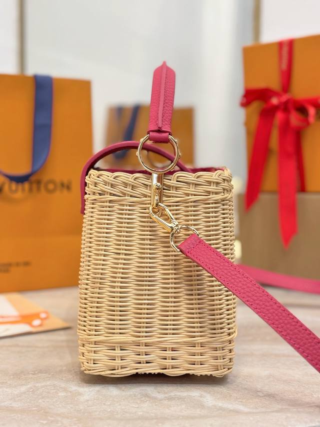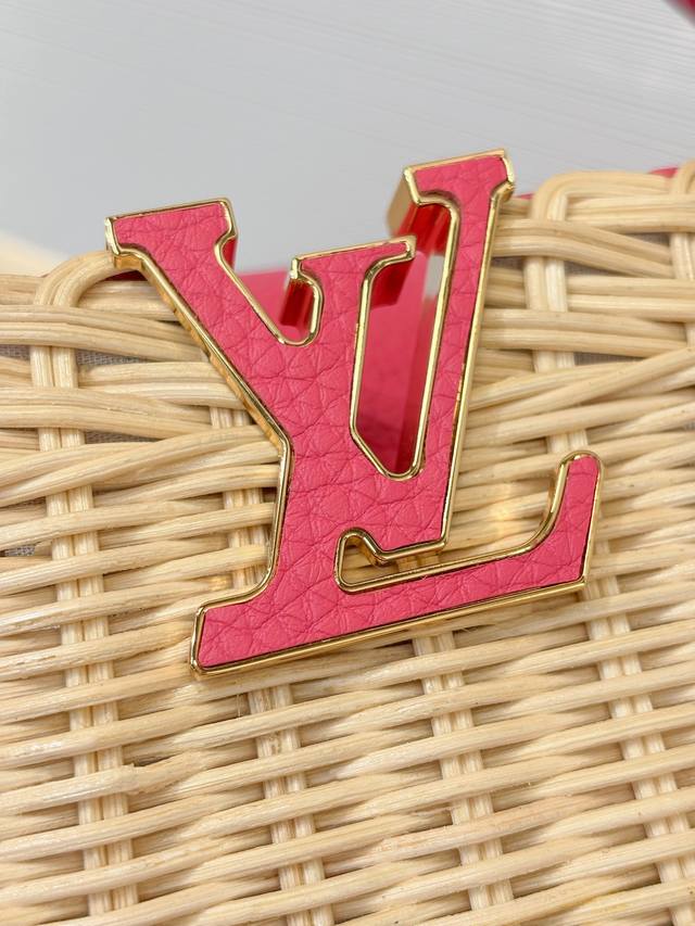 This Capucines Bb bag evokes the brand's Picnic trunk, launched in 1892, embodying a sense of holiday chic through its sophisticated design. The rattan body requires several days of meticulous weaving, yet offers ample space for everyday essentials. The flap can be positioned freely inside or outside, and the Lv monogram and printed lining reinforce the brand's identity. Size: 27x18x9cm