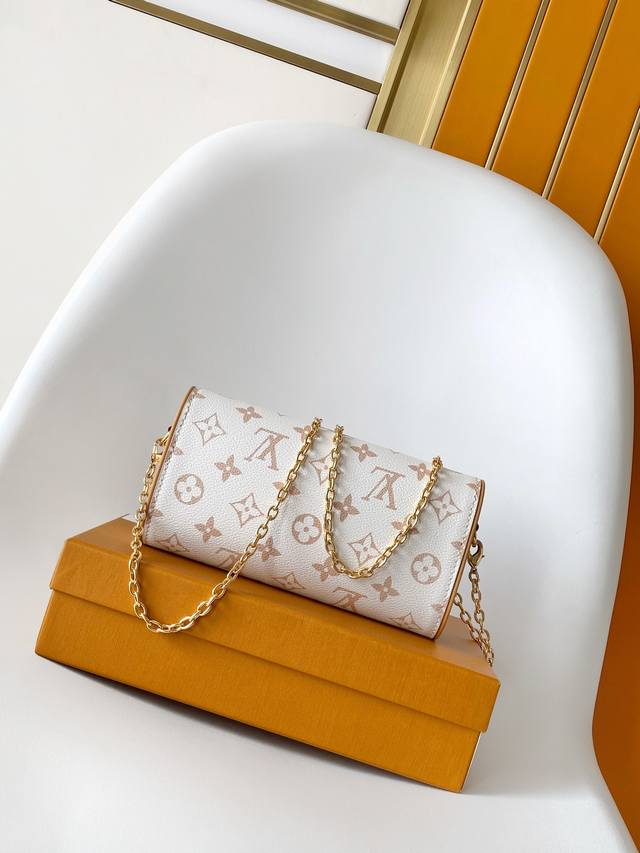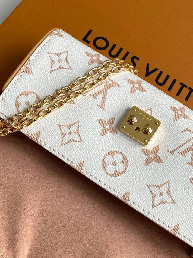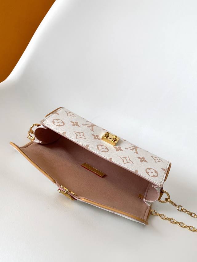M26583 Top-tier original Pochette Camille handbag (163 chip). This Pochette Camille Lt handbag is draped in Monogram Dune canvas, paying homage to the original design from Louis Vuitton's Spring/Summer 2000 runway show with a trendy style. The calfskin leather trim adds a touch of sophistication, and the detachable chain and dazzling S-Lock clasp complement each other perfectly. It can be worn crossbody, over the shoulder, or carried by hand. Dimensions: 11 x 6 x 20.5 cm (H x W x Length).