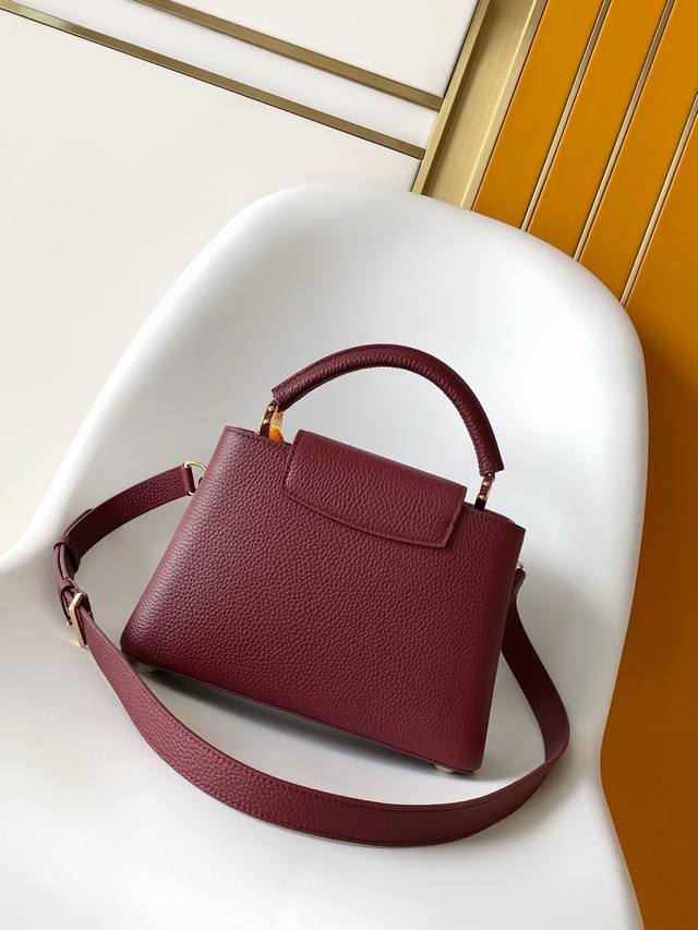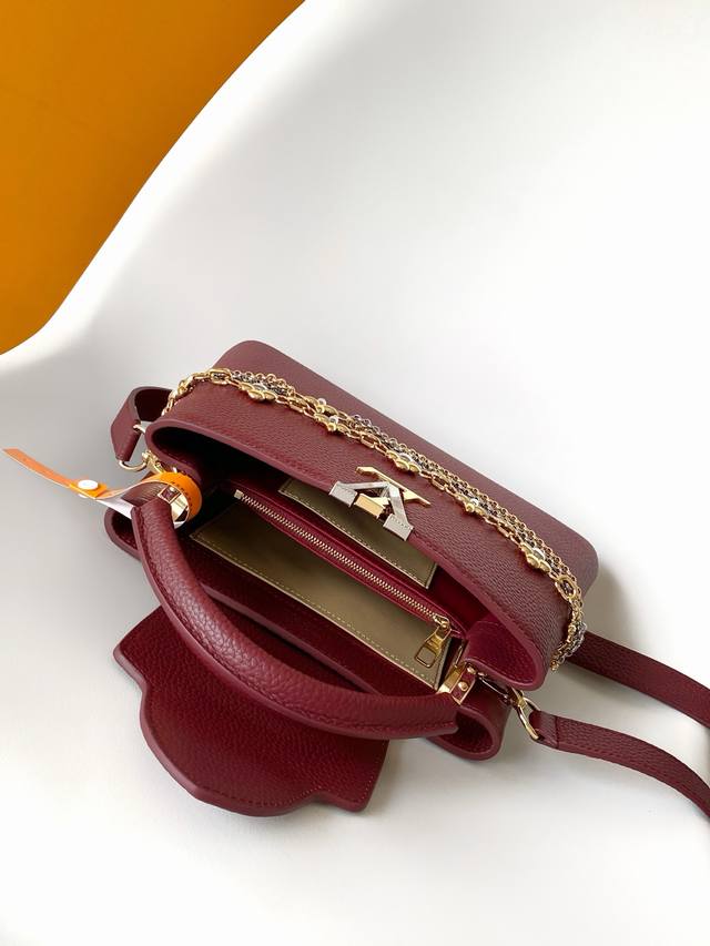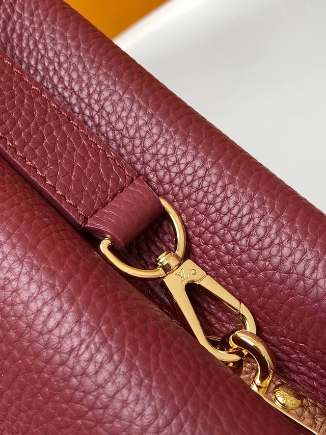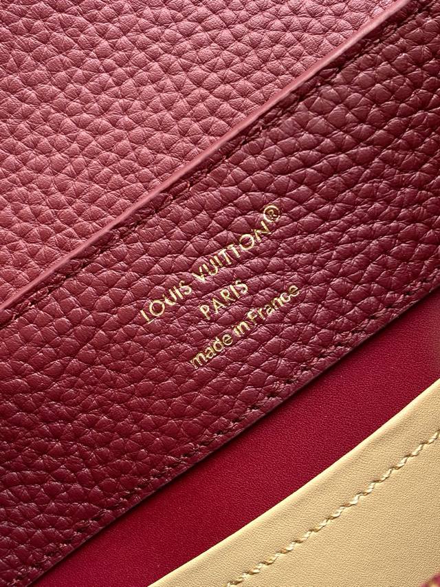 M27035 Blue, M27034 Purple-Red, M27039 Pink, M26507 Watermelon Red, M26351 Black, White, M26814 Black, M26345 Off-White. The Capucines Mini is a sophisticated accessory suitable for both day and night occasions. It features an infinity chain design inspired by the brand's jewelry and is crafted from this season's signature deep purple hue of Tavellon leather. Double-galvanized hardware details, including the iconic LV initials presented in a sunburst finish with a radiating pattern, add a touch of luxury. The detachable shoulder strap allows you to wear it as a shoulder bag, slung across one shoulder, or carry it by hand from the top handle. Ddd 21 x 13.6 x 8 cm (L x H x W) Ddd 27 x 17.3 x 9 cm (L x H x W) Ddd 22 x 12 x 8 cm (L x H x W) Horizontal White Ddd. Toryong Leather. Toryong Leather Trim . Cowhide Lining Ddd. Gold and Silver Hardware Ddd Two Wearing Options: Fold-down or Pull-out Flap. Divided Lining with a Flat Pocket. Four Metal Bases at the Bottom for Protection Ddd. Storage: Smartphone, Capucines Compact Wallet, Keys. Shoulder Strap: Detachable and Adjustable. Minimum Shoulder Strap Length when Carrying Over the Shoulder: 46.5 cm Ddd. Maximum Shoulder Strap Length when Carrying Over the Shoulder: 54.0 cm Ddd Handle: Minimalist Ddd