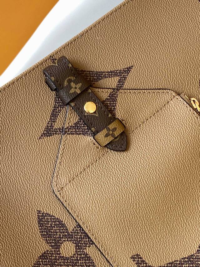 M46823 Premium Original Dynamic Code Change. This Onthego Voyage Tote is crafted from Giant Monogram canvas and Monogram Reverse canvas, creating a two-in-one design: the inner zippered clutch cleverly transforms into a waist bag for a passport and phone. The sophisticated design easily attaches to LV Horizon luggage, and the detachable and adjustable shoulder strap allows for a comfortable travel experience. 43.0 x 33.0 x 18.5 cm (L x H x W)