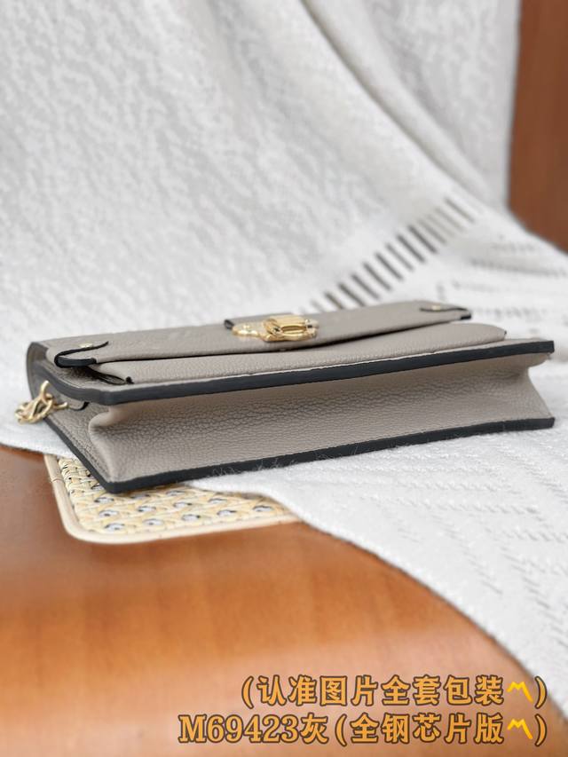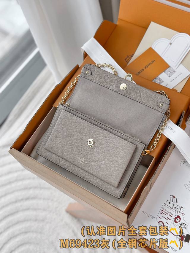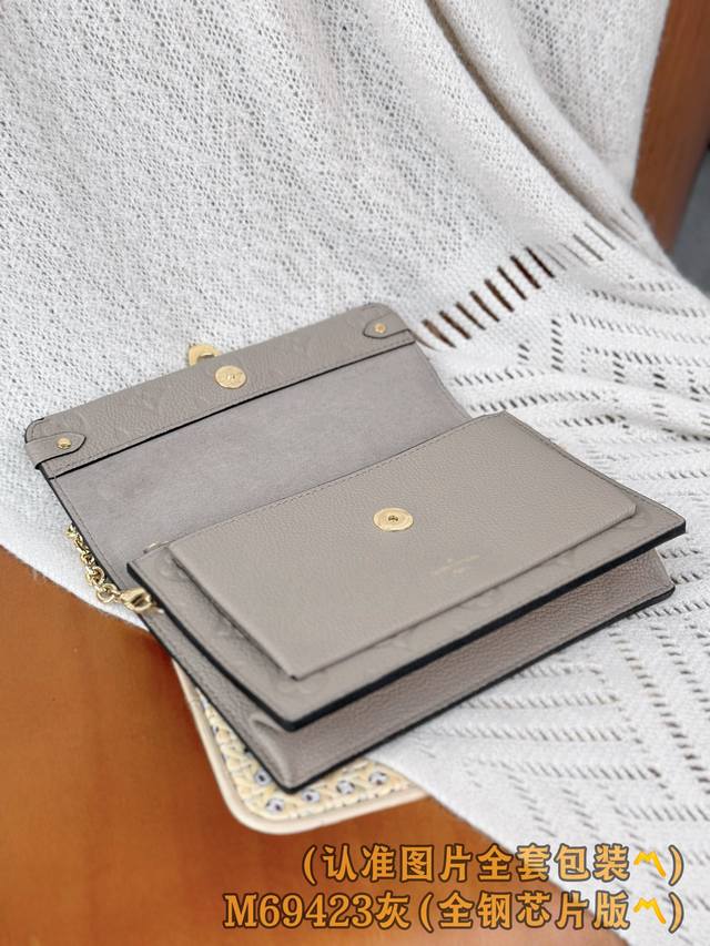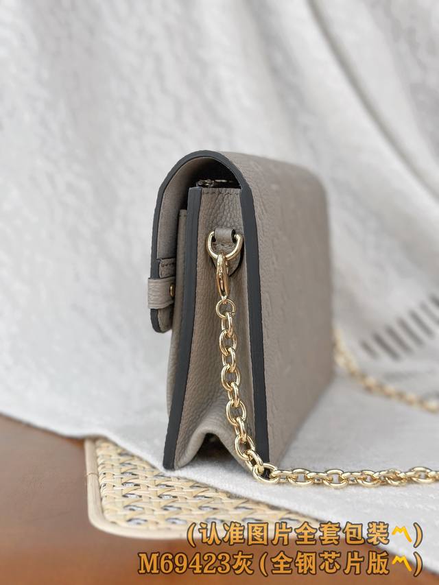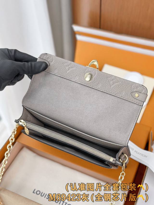 M69423 Embossed grey A-grade all-steel personalized edition! 163 variable code chip! Vavin chain wallet, this Vavin chain wallet is made of Monogram Empreinte leather and decorated with a gold-tone clasp, inspired by Louis Vuitton luggage. This season's style features a delicate tone-on-tone embossed print, which further enhances the chain wallet's classic shape. The front pocket is embossed with the Louis Vuitton logo and can hold a mobile phone. The interior is equipped with multiple pockets and compartments for extra convenience.